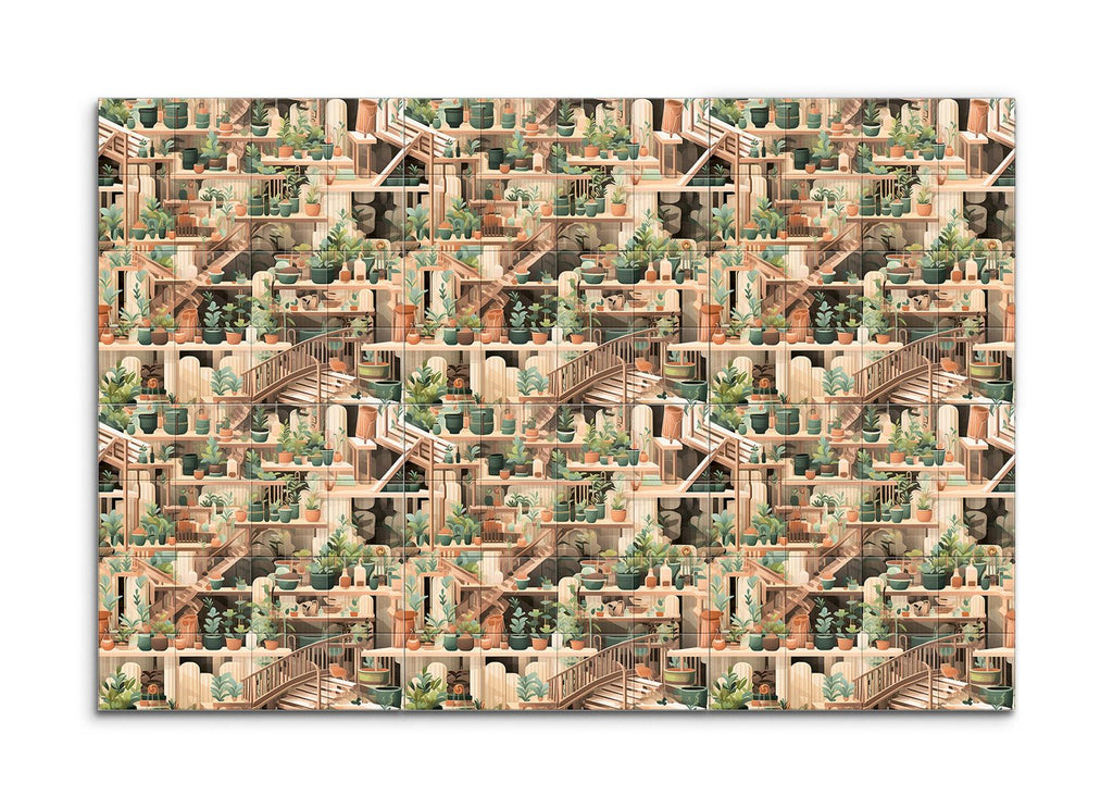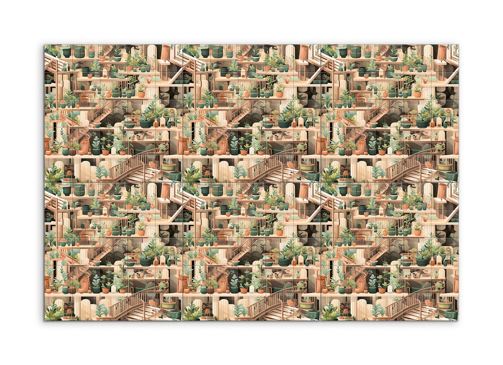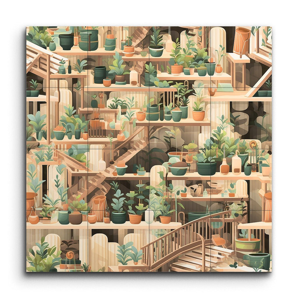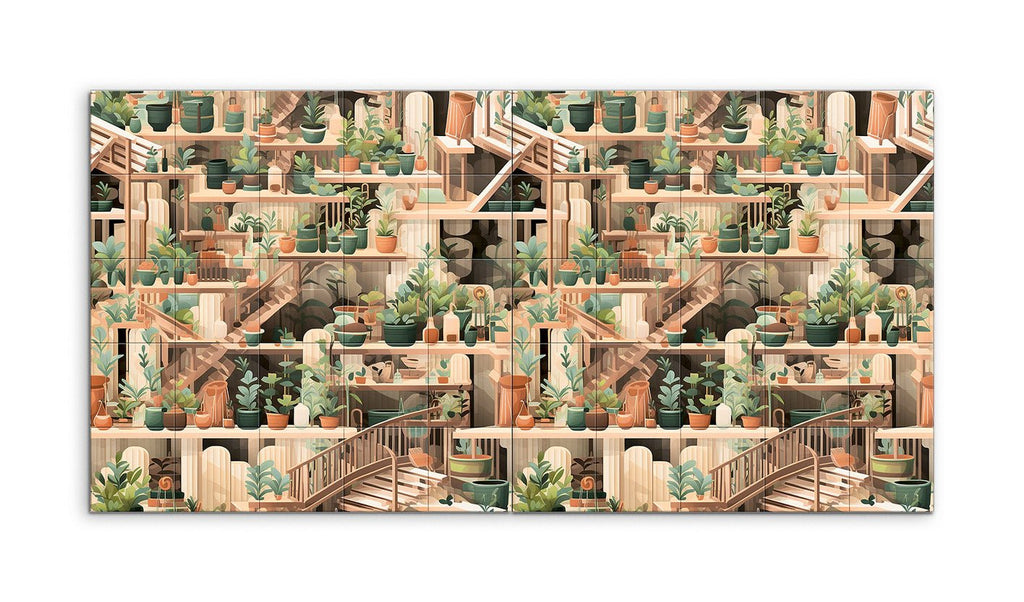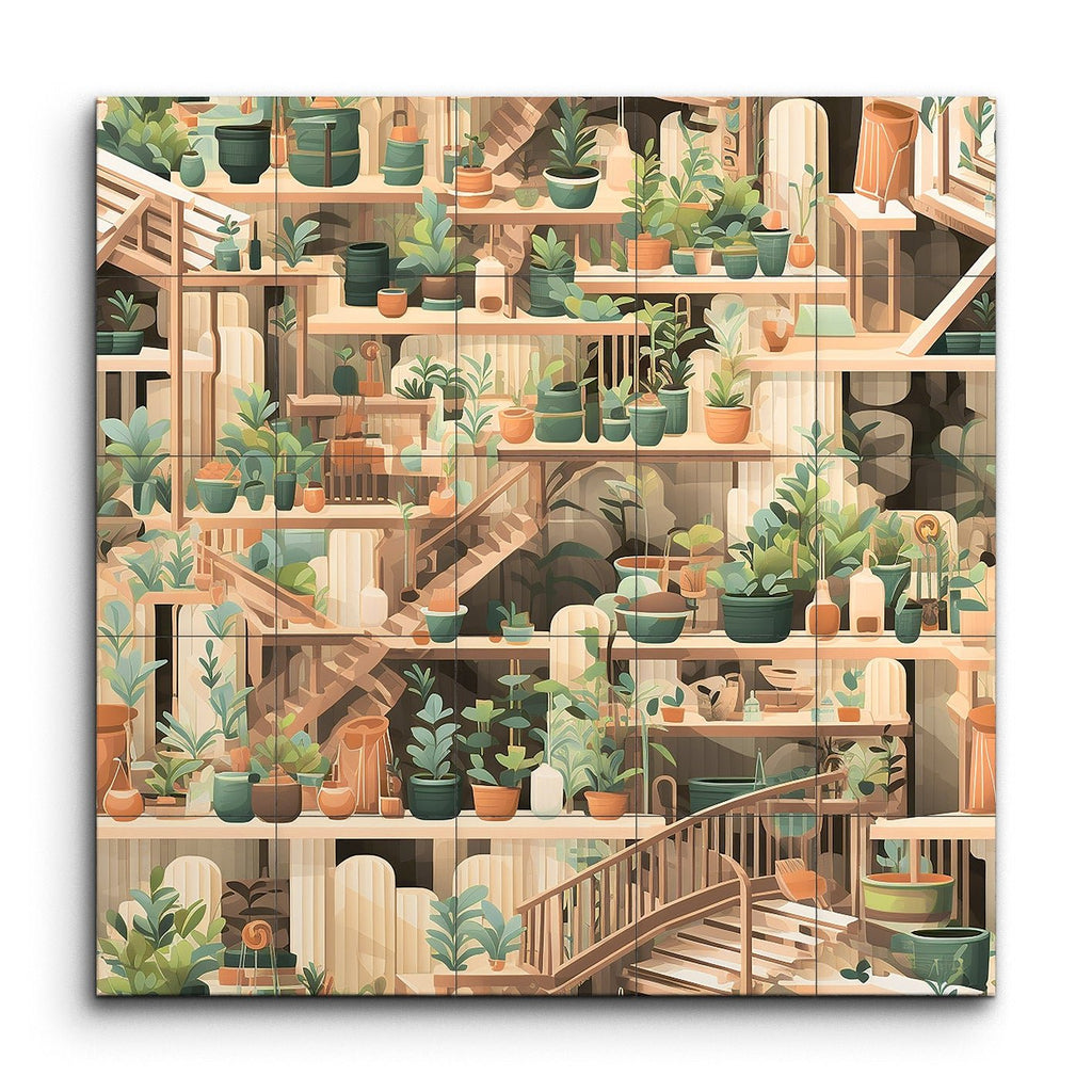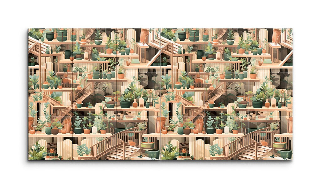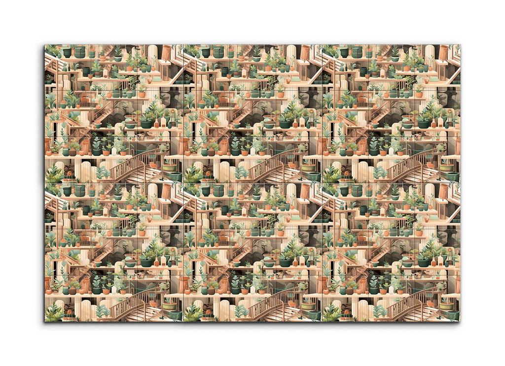 Transforma tu espacio con este cautivador mural de azulejos, que presenta una escena de jardín interior de múltiples niveles que combina armoniosamente formas geométricas y orgánicas. Dominado por tonos terrosos de verde, marrón y beige, la obra crea una atmósfera natural y relajante. Escaleras y escalerillas intrincadas conectan varios niveles adornados con diversas plantas en macetas, herramientas de jardinería y accesorios. Esta pieza algo abstracta, con sus ricos patrones y sutil uso de luz y sombra, te invita a explorar su tranquilo jardín curado.