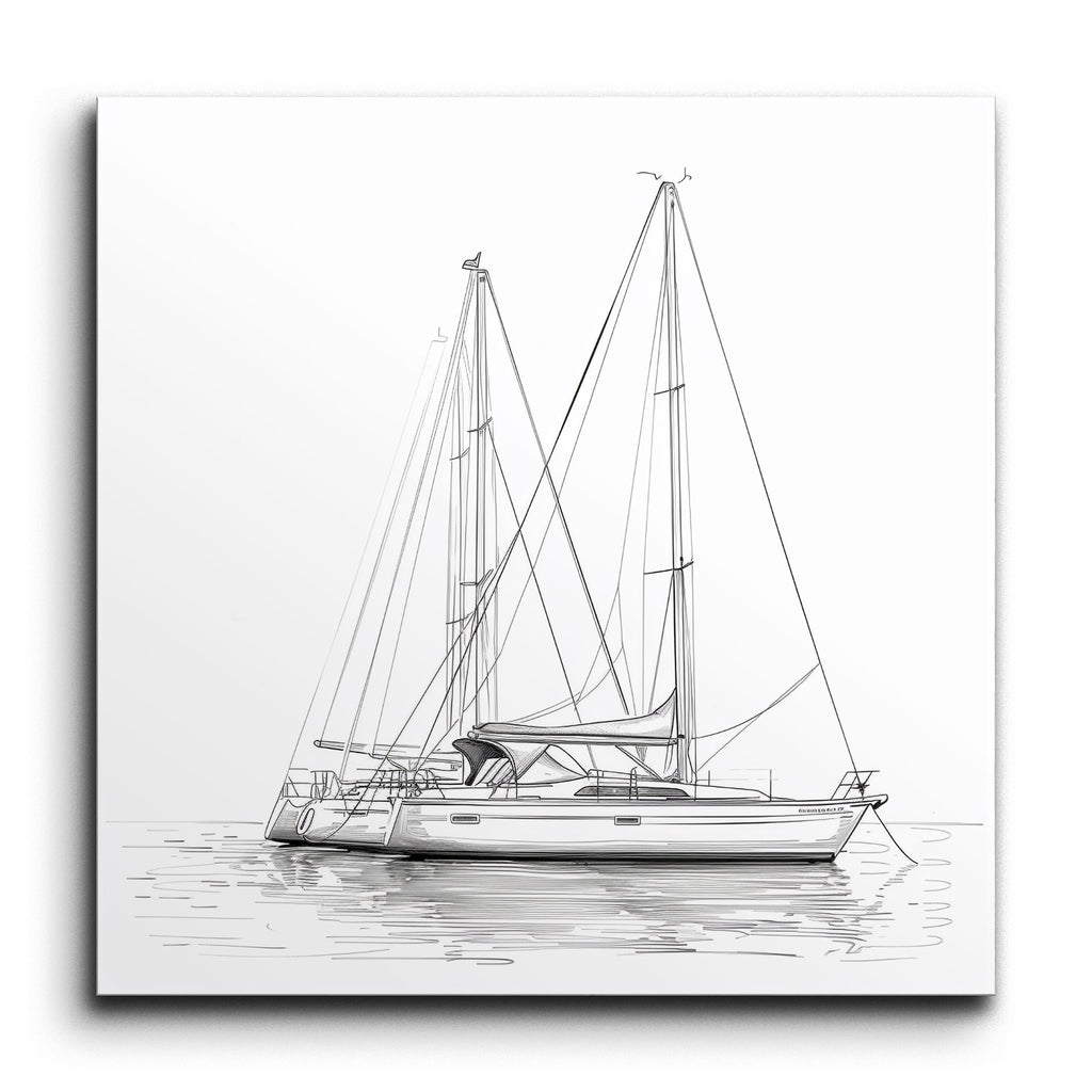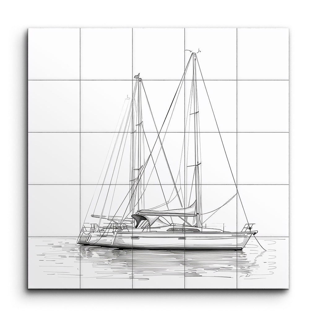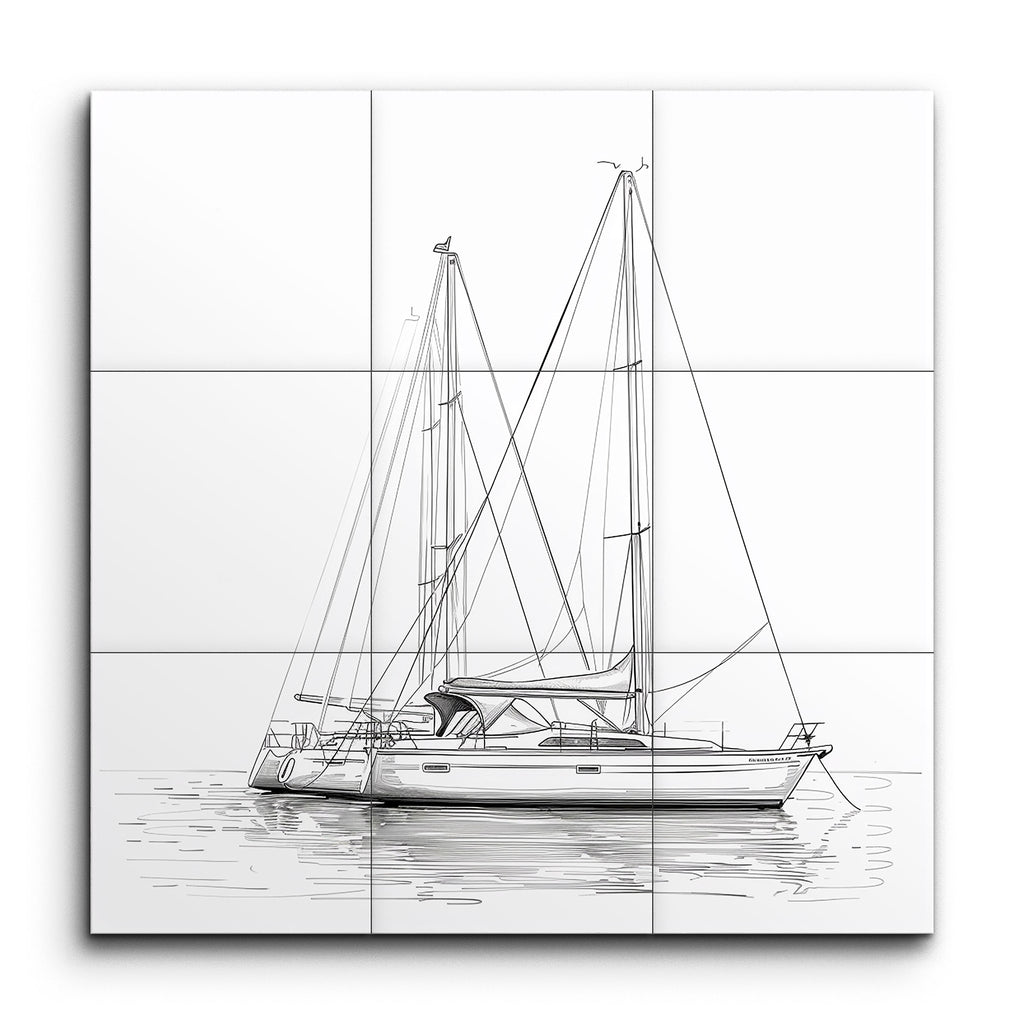 Transforma tu espacio con este exquisito mural de azulejos que presenta un dibujo lineal minimalista de un velero. La obra de arte captura la elegante esbeltez de un barco de dos mástiles, representado en finas líneas negras variadas que transmiten profundidad y dimensión. Las pinceladas horizontales del agua debajo evocan una atmósfera serena y tranquila, mientras que el estilo moderno y refinado se centra en la simplicidad y la claridad. Este mural encapsula bellamente la esencia de un velero, convirtiéndolo en una adición atemporal a cualquier entorno.
