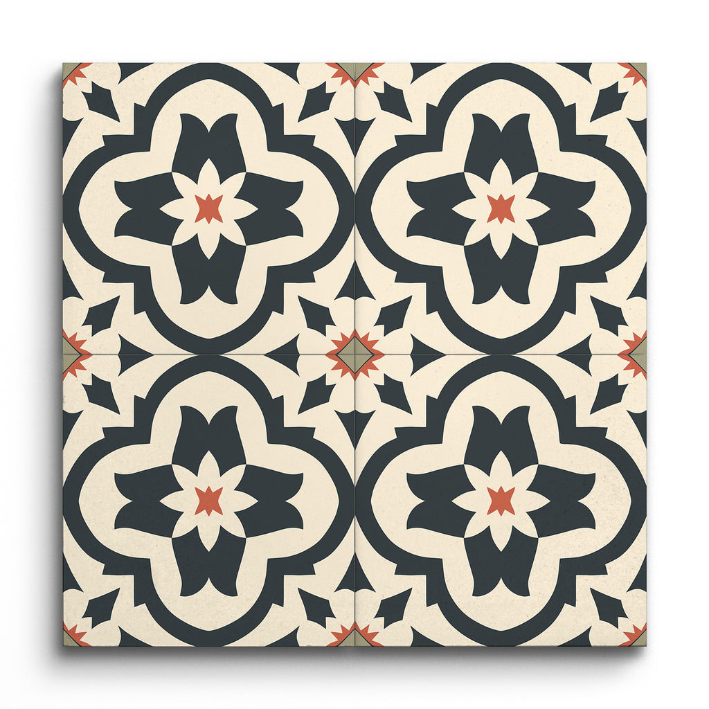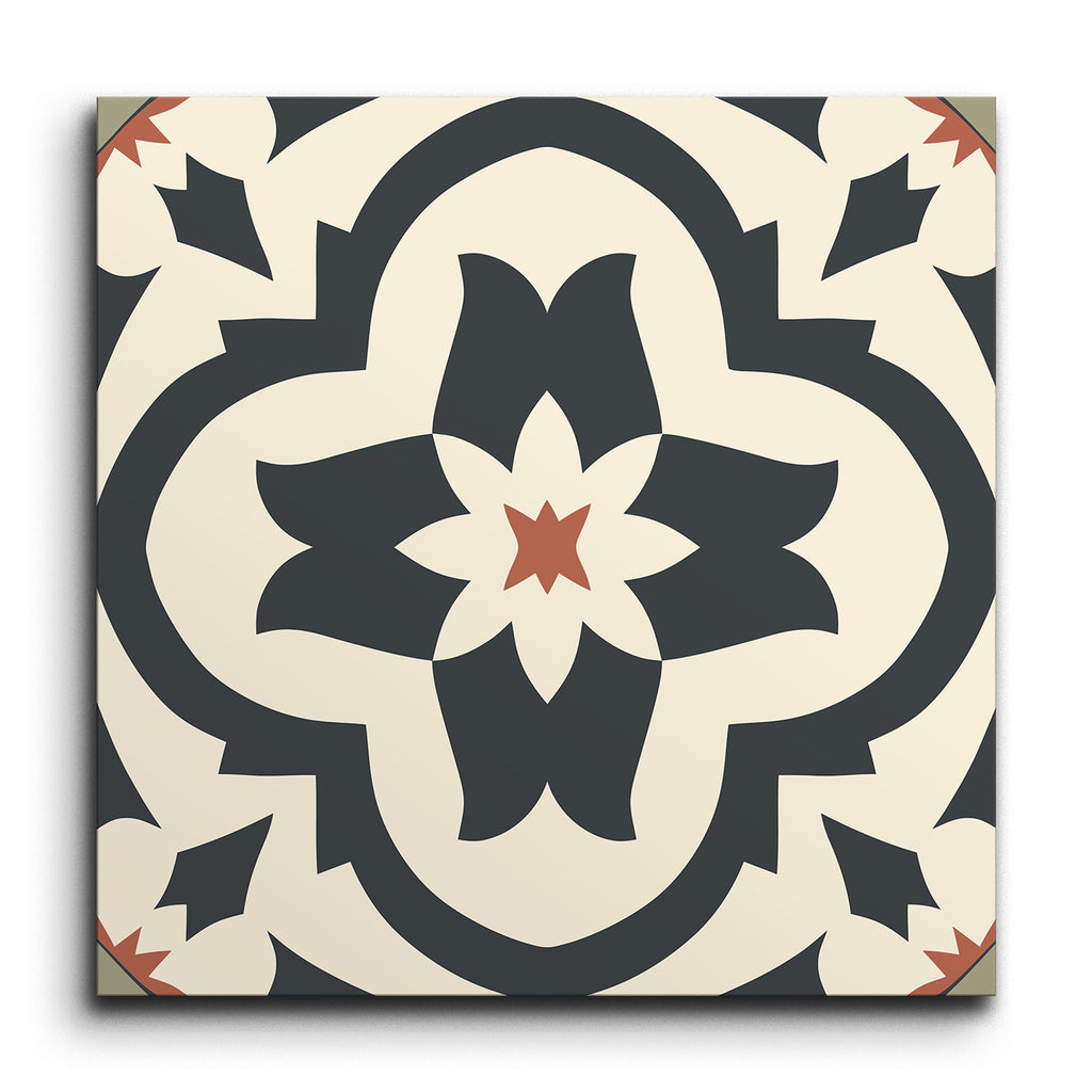 Este azulejo Decoración presenta un diseño simétrico centrado en un encantador motivo floral. La paleta incluye un rico gris carbón, una suave crema y toques de rojo óxido. Formas geométricas intrincadas se entrelazan para crear un patrón armonioso y equilibrado. Recordando a los azulejos encaústicos tradicionales, el diseño detallado y colorido combina líneas audaces con tonos sutiles, ofreciendo un atractivo atemporal que complementa muchos estilos de interiores.