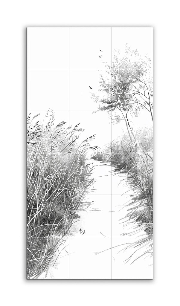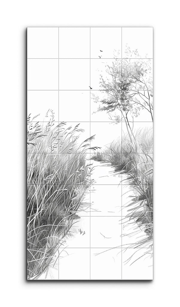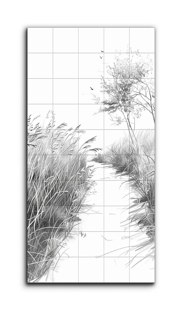 Este mural de azulejos captura una escena natural tranquila en tonos monocromáticos de gris. Un camino estrecho serpentea a través de altas y densas hierbas, invitando al ojo del espectador a explorar más profundamente la obra de arte. Los intrincados detalles en las hierbas y el árbol delgado con escasa follaje a la derecha añaden textura y profundidad. Delicados pájaros en vuelo aportan un toque de movimiento y vida. El trabajo de líneas minimalista y detallado y el sutil sombreado crean una atmósfera serena y elegante, destacando la belleza del paisaje.