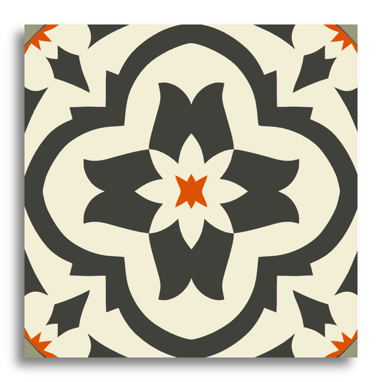 Ce carreau Décor présente un design symétrique centré autour d'un charmant motif floral. La palette comprend un riche gris charbon, une douce crème et des touches de rouge rouille. Des formes géométriques intriquées s'entrelacent pour créer un motif harmonieux et équilibré. Évoquant les carreaux encaustiques traditionnels, le design détaillé et coloré allie des lignes audacieuses à des teintes discrètes, offrant un attrait intemporel qui complète de nombreux styles d'intérieur.
