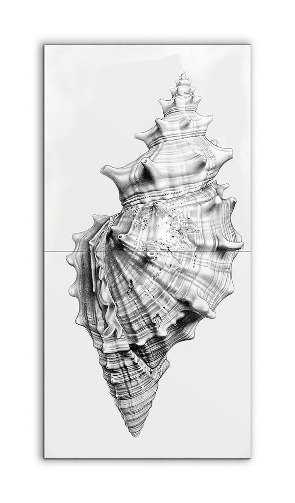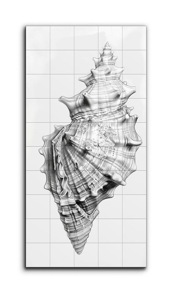 Este mural de azulejos presenta una representación altamente detallada y realista de una concha marina, realizada en una paleta monocromática de negro, blanco y gris. Las líneas intrincadas y las técnicas de sombreado crean una apariencia tridimensional, enfatizando la textura y la forma de la concha. Con su estructura en espiral, múltiples crestas y surcos, la obra captura los patrones y contornos naturales con precisión. La composición es limpia y centrada, colocando la concha marina contra un fondo simple para resaltar su complejidad y belleza.