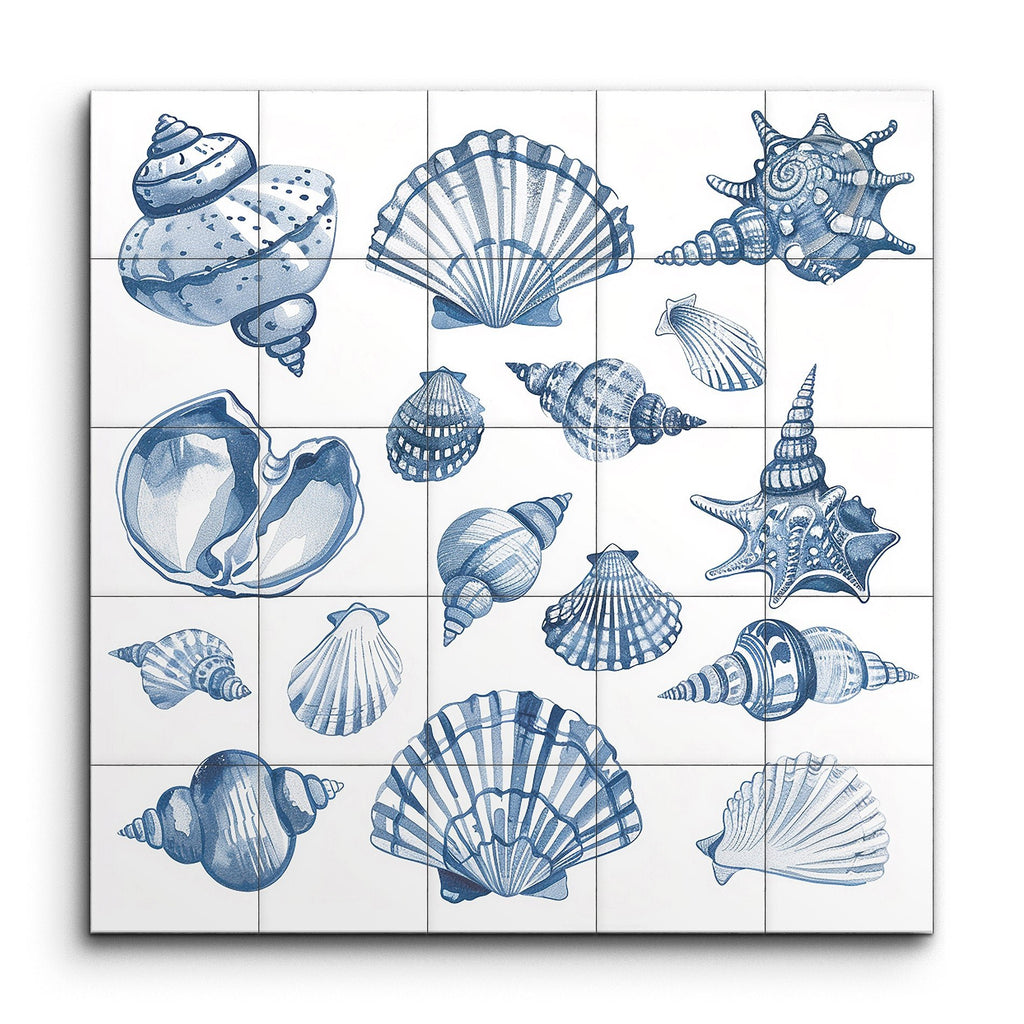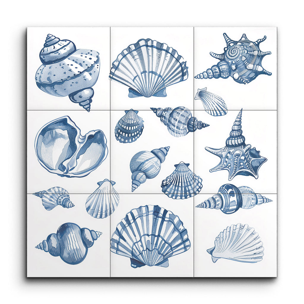 Transforma tu espacio con nuestro impresionante mural de azulejos que presenta una ilustración meticulosamente detallada de varias conchas marinas, todas representadas en una serena paleta de azul monocromático. Cada concha, desde el caracol espiral hasta la vieira en forma de abanico y la almeja abierta, está intrincadamente dibujada con precisión y profundidad, reminiscentes de las ilustraciones científicas tradicionales. Los tonos azules armoniosos y la apariencia tridimensional crean una experiencia visual cautivadora y cohesiva, perfecta para añadir un toque de elegancia costera a cualquier entorno.