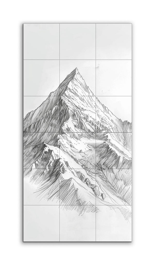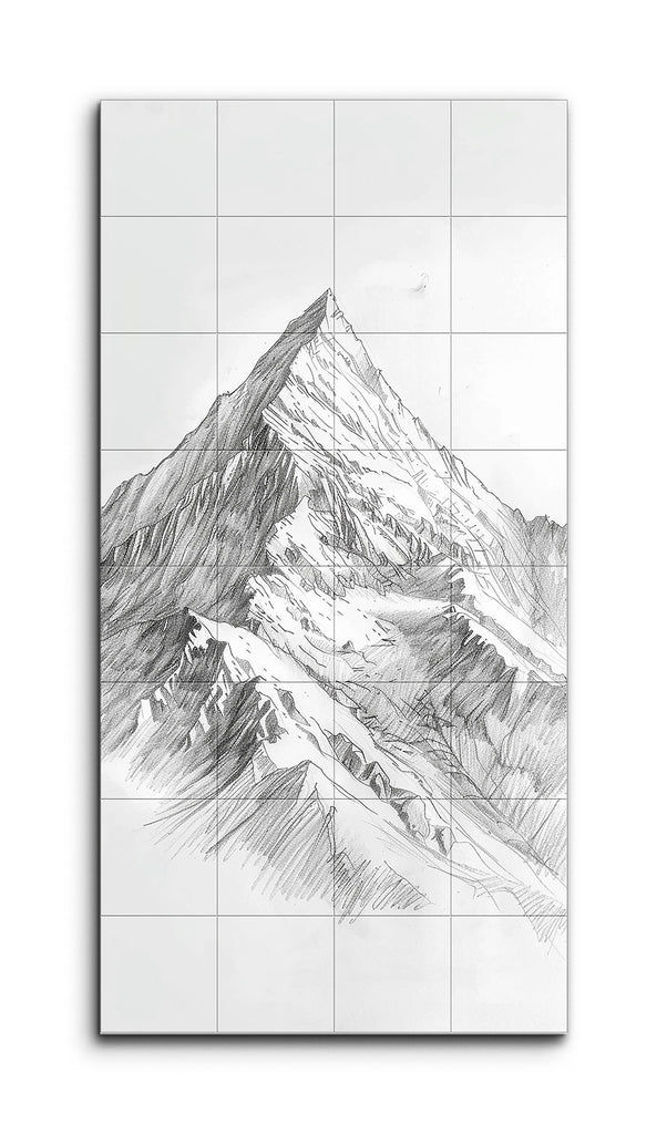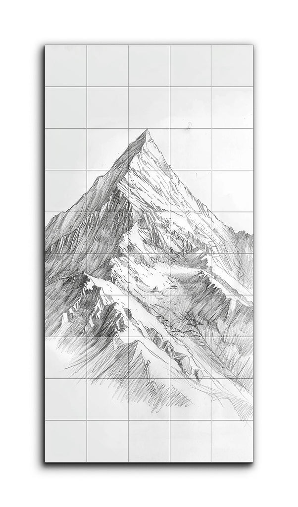 Este mural de azulejos presenta un boceto a lápiz meticulosamente detallado de una montaña, mostrando picos afilados y escarpados y pendientes pronunciadas. El artista utiliza líneas finas y sombreados para enfatizar las superficies rocosas y la interacción de la luz y la sombra, creando profundidad y textura. La paleta monocromática se basa en diferentes intensidades de lápiz para resaltar la forma y la estructura de la montaña. La composición vertical, con el pico alcanzando hacia la parte superior, evoca una sensación de altura y grandeza, enfocando la atención en la majestuosa topografía de la montaña.