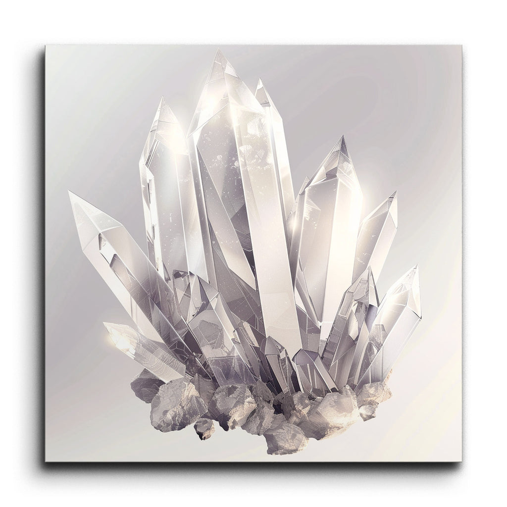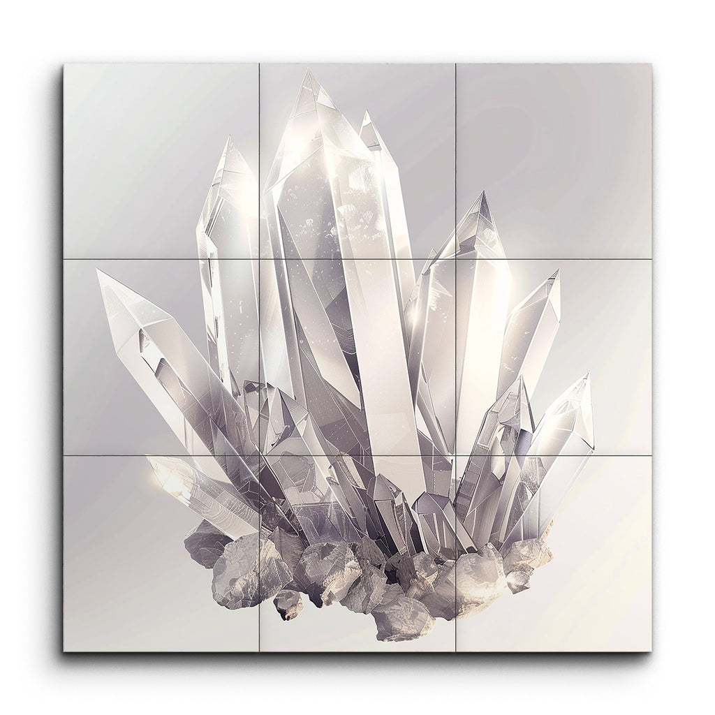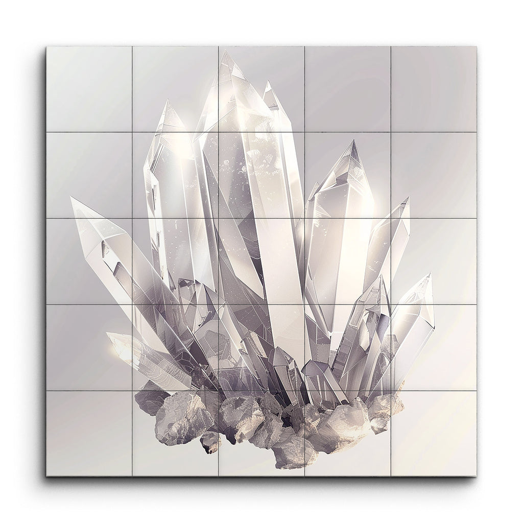 Eleva tu espacio con este impresionante mural de azulejos que presenta un grupo fotorealista de cristales de cuarzo transparente. Cada cristal está meticulosamente detallado, mostrando facetas angulares y nítidas y una calidad translúcida que captura la luz de manera hermosa. La base rugosa y terrenal contrasta con los cristales suaves y similares al vidrio, enfatizando su belleza natural. La paleta de colores fríos y neutros y la composición equilibrada atraen la vista hacia arriba, creando un punto focal cautivador que irradia claridad y pureza.