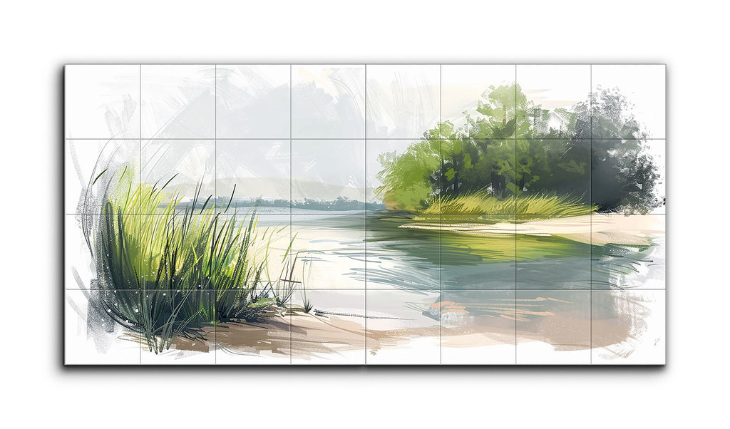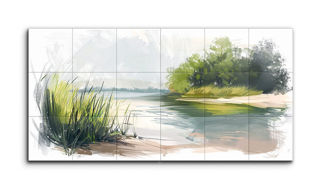 Este mural de azulejos en díptico captura un paisaje sereno, probablemente a orillas de un río o un lago, utilizando un estilo impresionista. Amplios y sueltos trazos de pincel sugieren formas naturales sin una delimitación precisa. En el primer plano, trazos vibrantes de verde y amarillo representan hierbas iluminadas por el sol. Suaves trazos horizontales en azul y verde transmiten agua tranquila. Una orilla arenosa se transforma en un segundo plano vegetativo. El fondo presenta una pequeña isla con árboles en sombra. Ligeros trazos de pincel insinúan el cielo, enfatizando la escena pacífica y contemplativa.