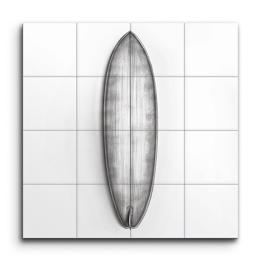 Transforma tu espacio con nuestro impresionante mural de azulejos, que presenta una ilustración de tabla de surf meticulosamente detallada. Esta obra de arte captura la elegancia del diseño de tablas de surf, presentándola desde una vista superior para mostrar su forma alargada y aerodinámica. La punta afilada y la cola redondeada, completadas con una sola aleta, están representadas con líneas finas y un sombreado experto para crear un efecto tridimensional. La paleta minimalista y monocromática realza la forma y la estructura, encarnando una estética técnica y arquitectónica. Perfecto para entusiastas del surf y amantes del diseño finamente elaborado.