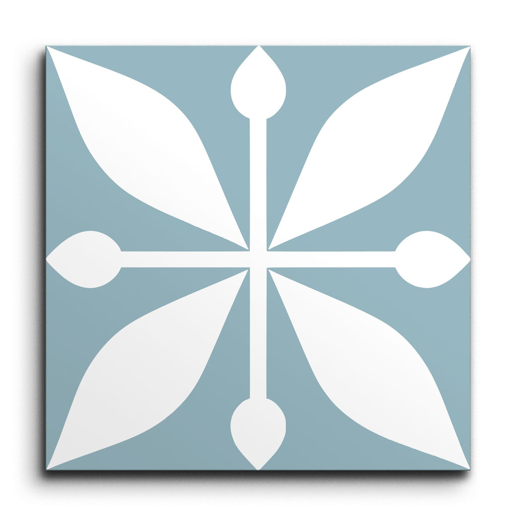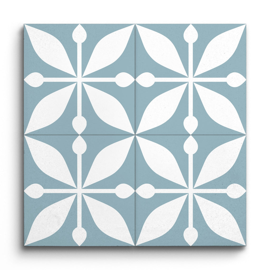 Este azulejo decorativo muestra un patrón armonioso de cuatro formas blancas similares a hojas que irradian elegantemente desde el centro, formando una estructura similar a una cruz. Sobre un fondo azul suave y apagado, el diseño blanco nítido resalta, ofreciendo un contraste llamativo pero sutil. El estilo encausto le otorga al azulejo un atractivo clásico y atemporal, evocador de estéticas tradicionales y vintage. Su paleta de colores discreta añade un toque de elegancia y sofisticación, convirtiéndolo en una opción versátil para una variedad de ambientes decorativos.