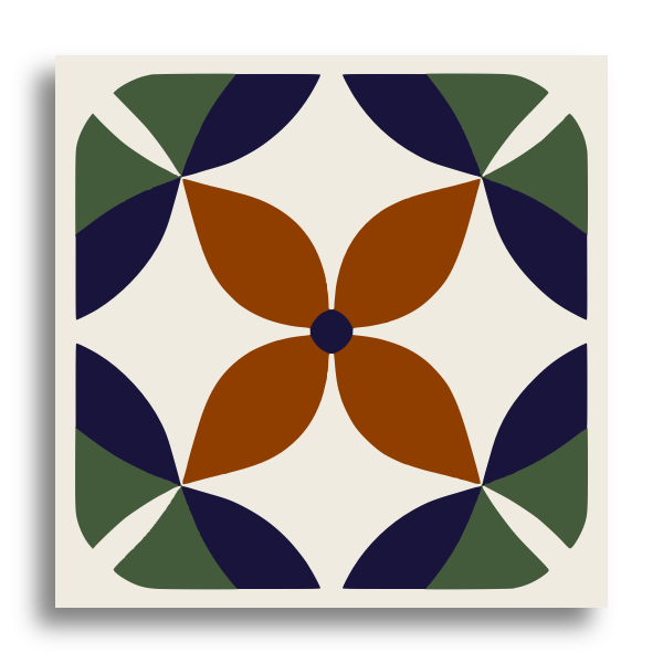 This decor tile showcases a captivating encaustic pattern, featuring a symmetrical geometric design centered around a flower-like motif. Curved shapes blend seamlessly to create a harmonious and balanced composition. The muted tones of terracotta, teal, and deep purple are beautifully contrasted against a cream background, lending a vintage yet timeless quality to the tile. This classic color palette and design make it a versatile choice for a range of design applications.