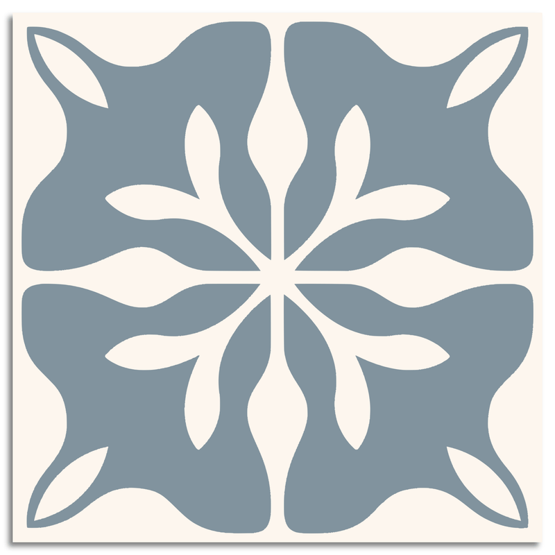 This decor tile showcases an enchanting encaustic pattern, with a harmonious blend of symmetry and intricacy. At its heart, a floral motif unfolds, its stylized petal shapes delicately radiating outward. The soft gray background provides a serene canvas, beautifully offset by off-white elements that enhance the design's elegance. This tile captures the essence of classic tradition, offering a timeless aesthetic that complements a variety of interiors.