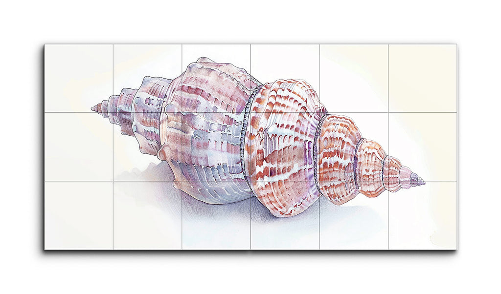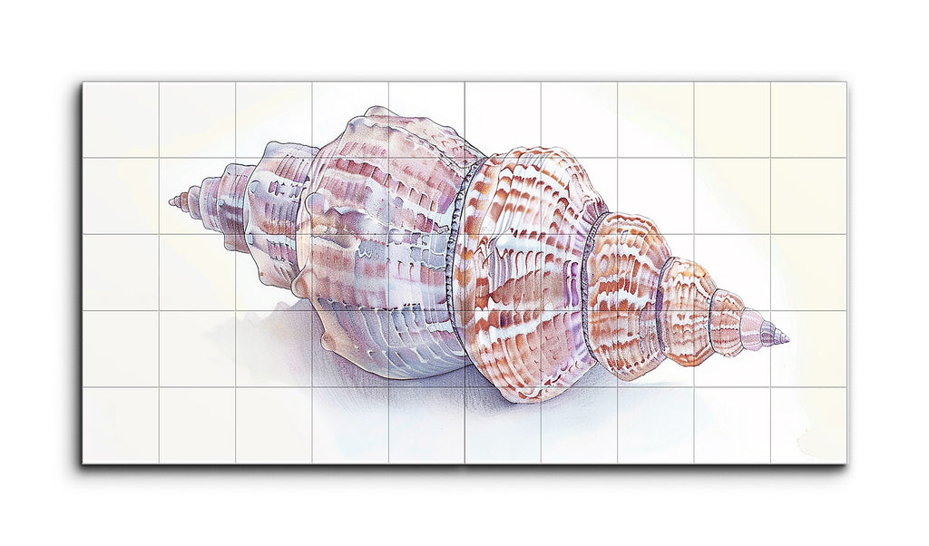 Este mural de azulejos presenta una representación hiperrealista de una concha en un formato dividido, extendido sin problemas a través de dos paneles. La meticulosa atención al detalle del artista resalta los intrincados patrones y texturas de la concha, utilizando varios tonos de rosa, blanco y marrón para destacar sus líneas y surcos naturales. El sutil juego de luz y sombra realza el efecto tridimensional, haciendo que la concha parezca casi tangible. El fondo minimalista asegura que la concha permanezca como el punto focal, enfatizando su delicada belleza.
