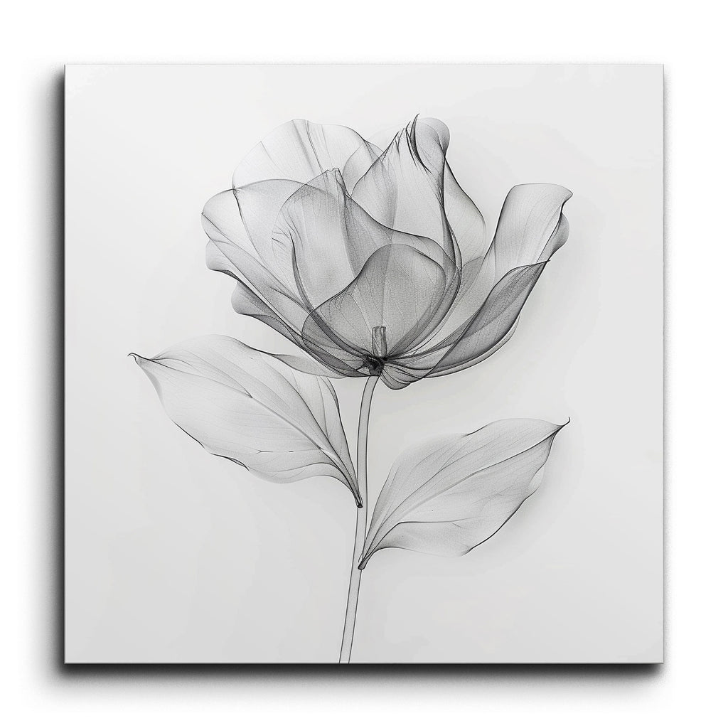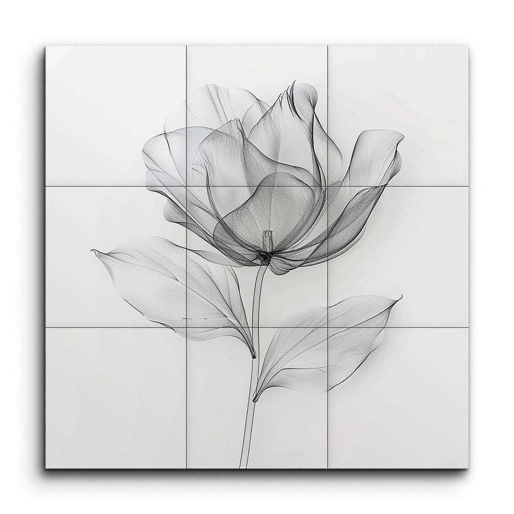 Sumérgete en la delicada elegancia de nuestro mural de azulejos, que presenta una flor etérea representada en un estilo minimalista y moderno. Líneas finas y etéreas crean una flor translúcida, casi fantasmal, con pétalos intrincadamente detallados que sugieren profundidad y textura. Las suaves y fluidas líneas del tallo y las hojas realzan la sensación de movimiento y gracia. Balanceado y armonioso, los tonos monocromáticos de gris y negro añaden simplicidad y sofisticación, fusionando la ilustración botánica con el arte abstracto para una estética ligera y etérea.