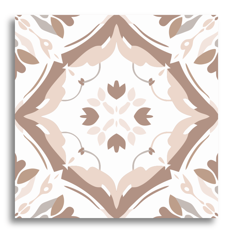 This decor tile showcases a symmetrical, floral-inspired design with a central motif that elegantly radiates outward. With soft, muted tones of beige, taupe, and gray, the pattern features stylized, abstract elements and flowing lines that create a harmonious and balanced aesthetic. Reminiscent of traditional encaustic tiles, its intricate design and classic appeal make it a versatile addition to a variety of decor settings.
