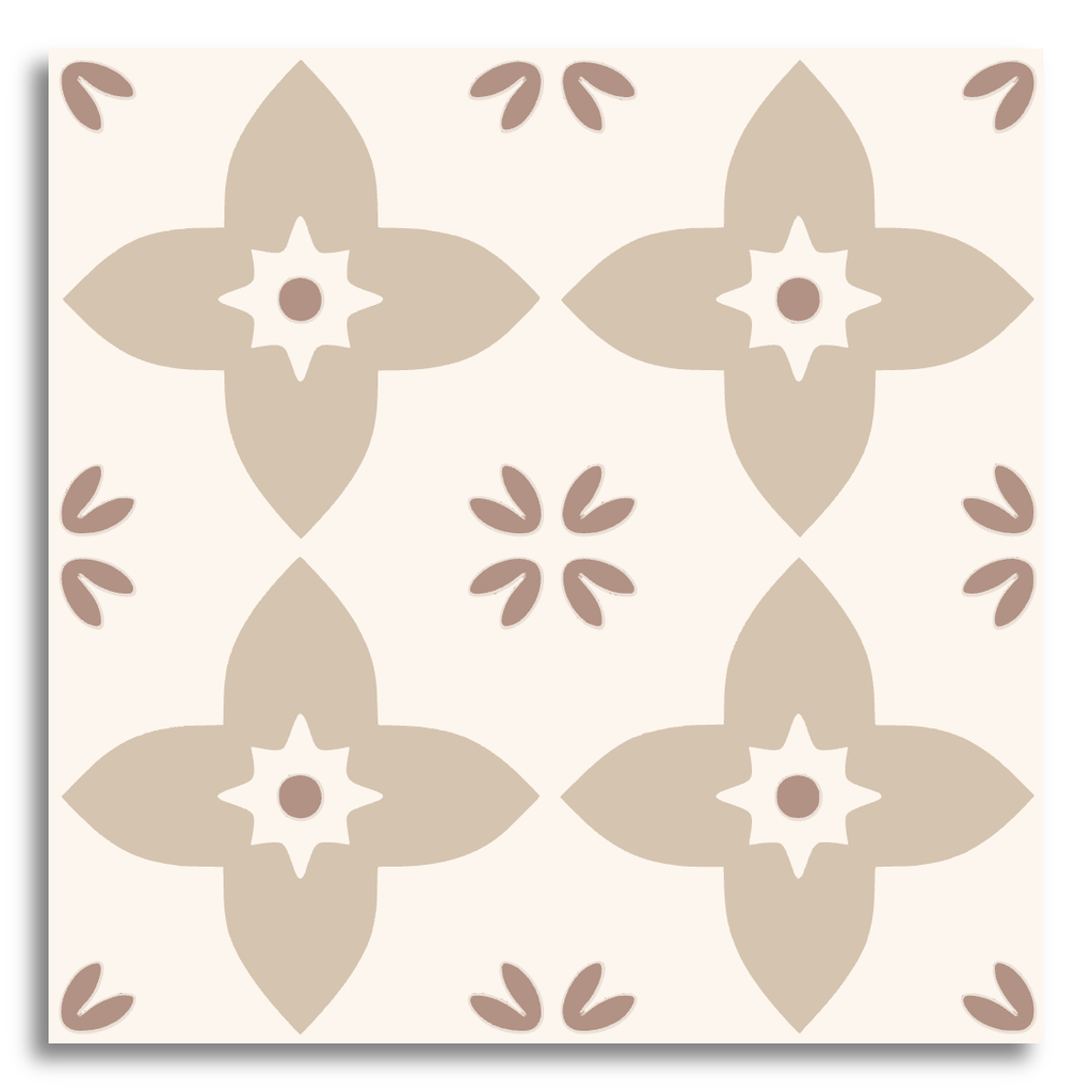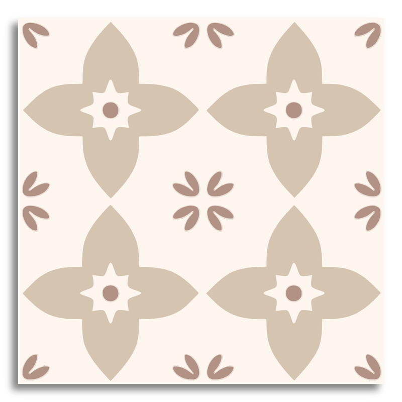 This decor tile showcases a symmetrical floral pattern, where four stylized flower shapes are arranged in a neat grid. At the heart of each flower is a star-like motif, encircled by delicate, leaf-like elements. The soft blue-gray and muted teal hues contrast gently with the cream background, creating a subtle and harmonious look. The design pays homage to traditional encaustic tiles, evoking a sense of vintage charm while offering a modern touch with its clean lines and balanced composition. Perfect for adding a hint of classic elegance to any space.