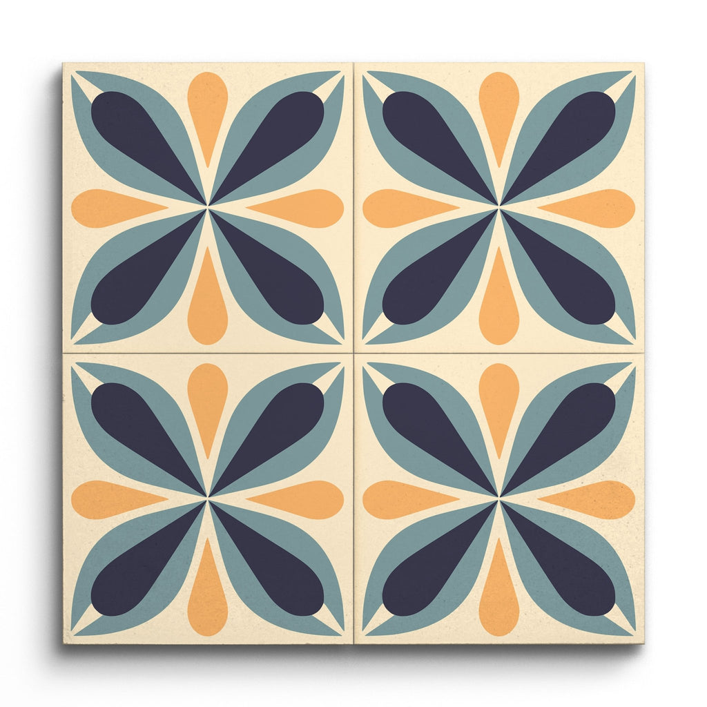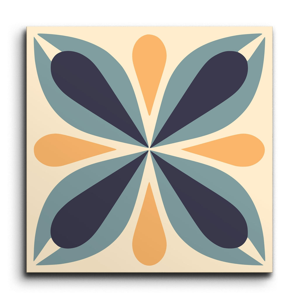 Este azulejo decorativo presenta un cautivador patrón geométrico, donde formas abstractas y audaces se unen para formar un llamativo motivo floral. La paleta combina un profundo azul marino, un verde azulado apagado y un cálido mostaza sobre un fondo crema, creando un efecto visual armonioso pero dinámico. La interacción de colores contrastantes y el diseño simétrico aportan un toque moderno y una sensación de equilibrio a cualquier espacio.