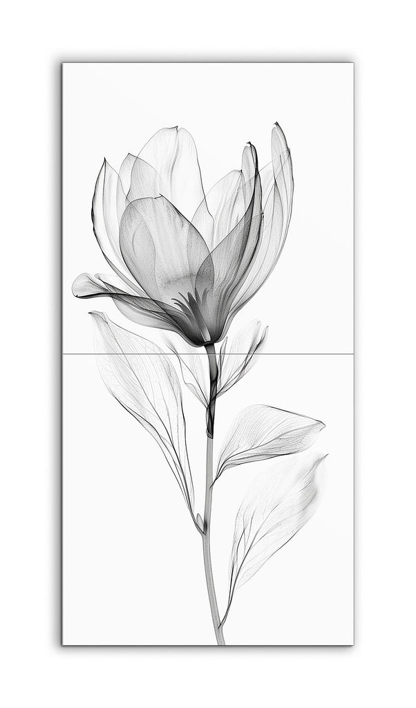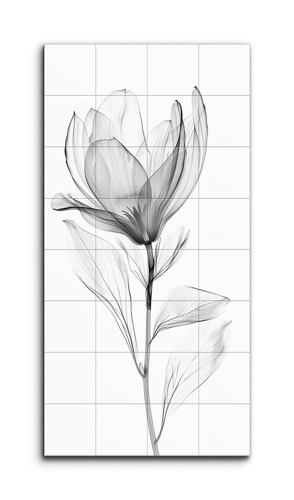 Este mural de azulejos presenta una sola flor, exquisitamente detallada, en una paleta de grises monocromática, reminiscentes de una ilustración botánica. Los pétalos translúcidos, con sus finas líneas y delicadas sombras, transmiten una calidad etérea y ligera. Las venas meticulosamente dibujadas y los tallos y hojas delgados y elegantes muestran una estética minimalista y refinada. Los sutiles gradientes de luz y sombra realzan la sensación intrincada y realista, enfatizando la belleza natural y la sofisticación de la obra de arte.