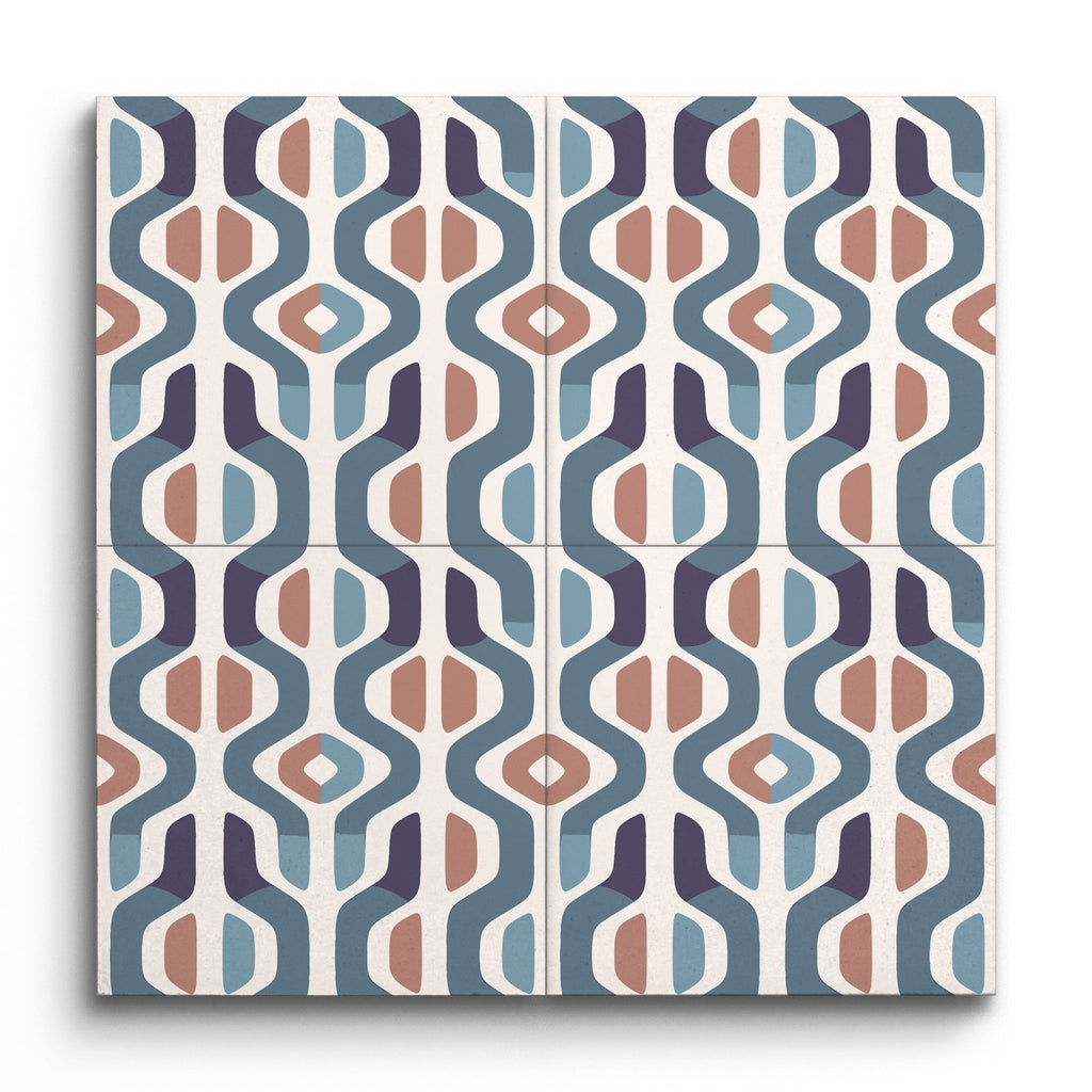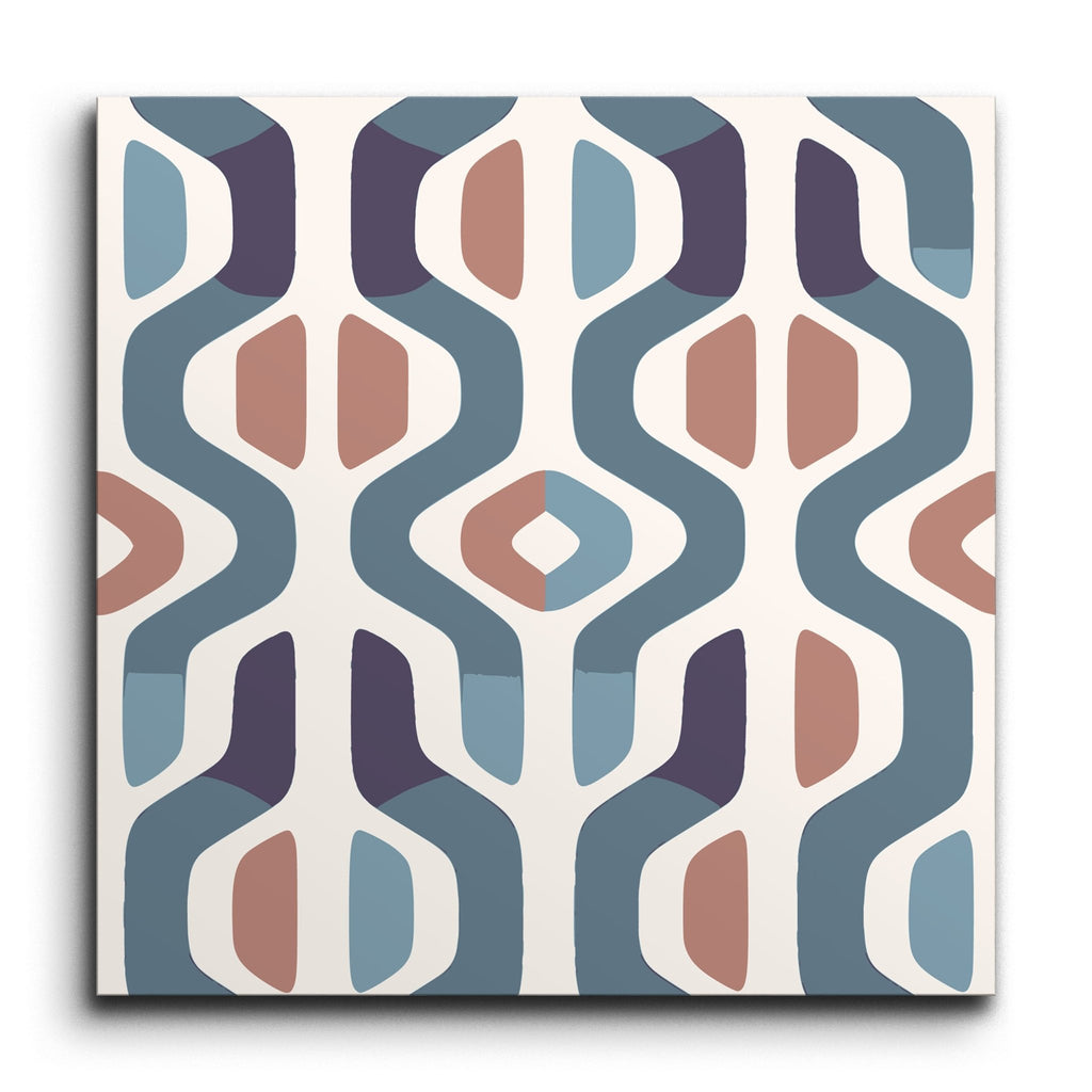 Este azulejo decorativo captura la esencia del estilo moderno de mediados de siglo con su llamativo diseño geométrico. Su patrón presenta una interacción dinámica de formas abstractas, creando un flujo rítmico que atrae la mirada. La paleta de colores, una mezcla de azules apagados, marrones y cremas, evoca el encanto nostálgico de la época mientras mantiene una elegancia atemporal. La simetría y el equilibrio están en el corazón de este diseño, ofreciendo una adición armoniosa a cualquier espacio.