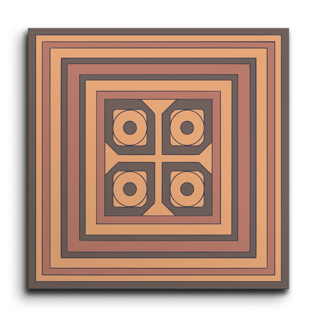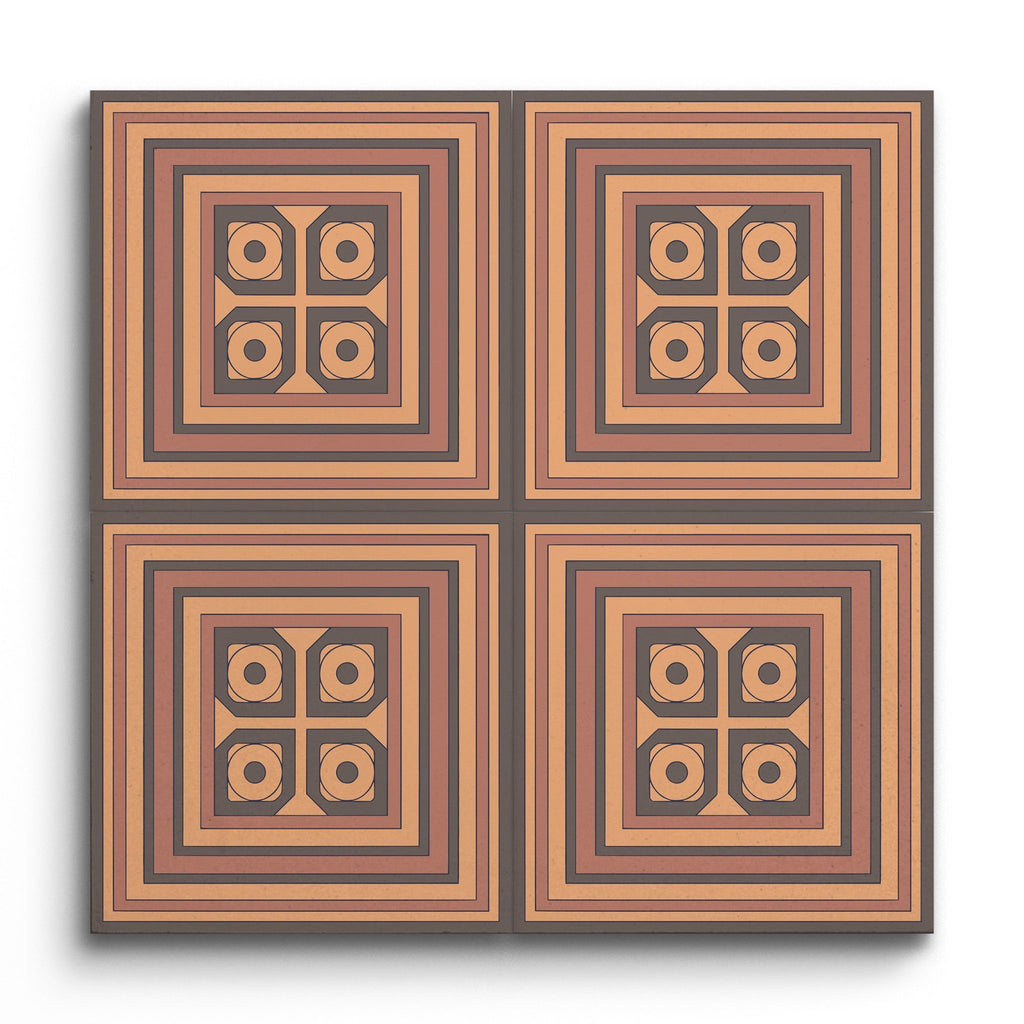 Este azulejo decorativo presenta un cautivador patrón geométrico con cuadrados y círculos concéntricos, destacando la simetría y la precisión. Los tonos cálidos de la tierra—marrones ricos, naranjas vibrantes y beiges suaves—añaden profundidad y equilibrio, creando una estética estructurada y moderna. Las formas repetitivas y la paleta de colores armoniosa lo convierten en una adición impactante a cualquier espacio.