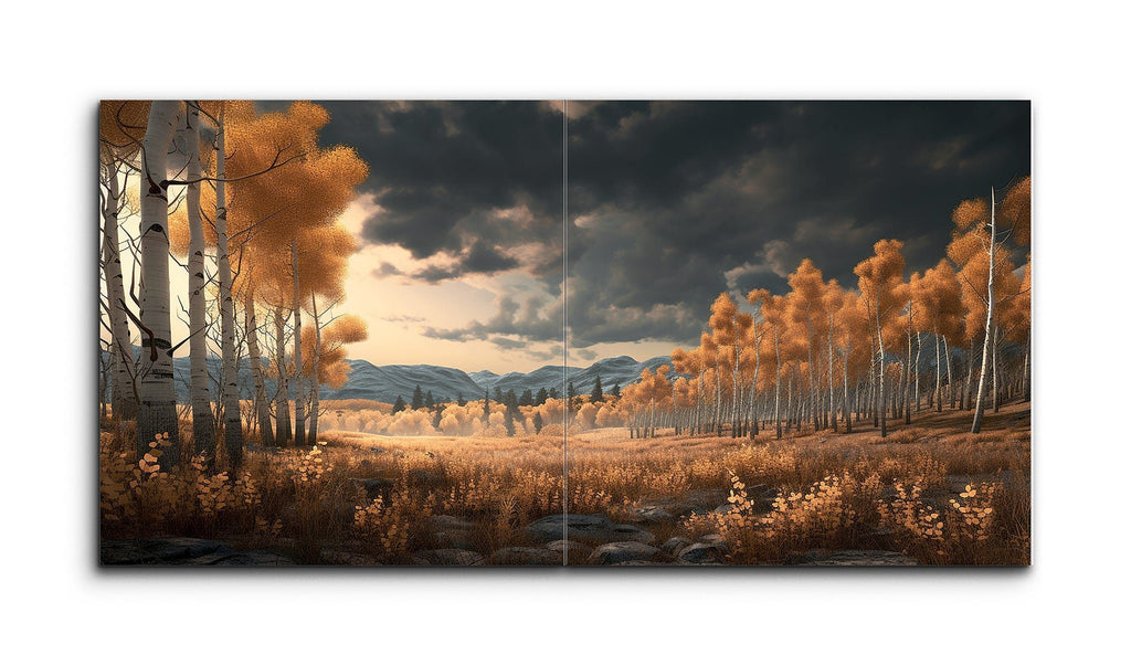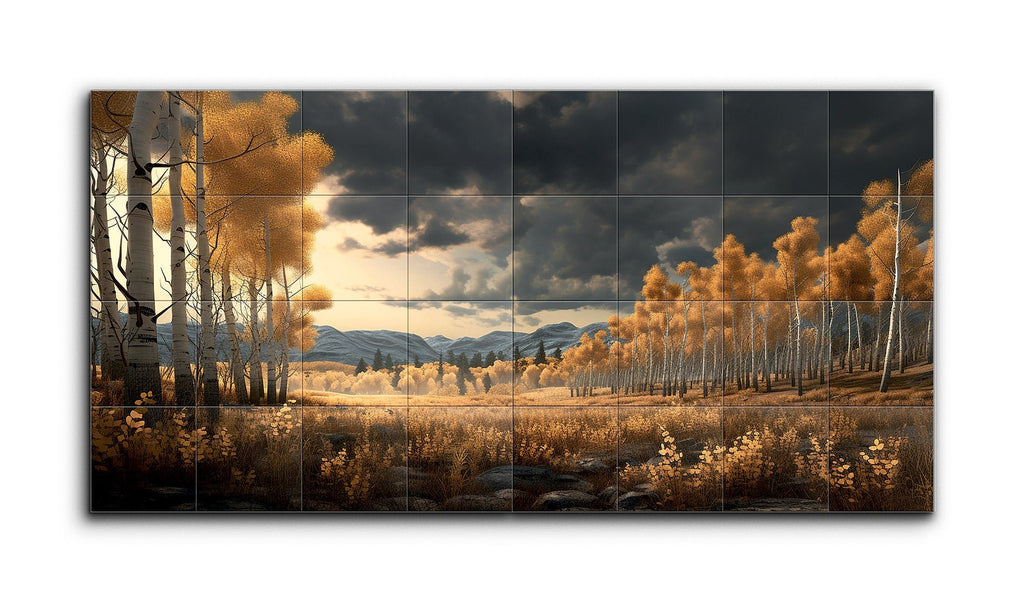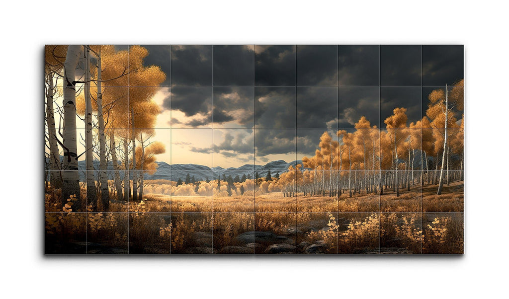 Este mural de azulejos muestra un sereno paisaje otoñal con un grupo de árboles altos y delgados adornados con un vibrante follaje dorado-anaranjado. La corteza blanca de los árboles contrasta maravillosamente con las cálidas hojas, realzado por una luz suave y difusa. Colinas rodantes cubiertas de nieve en el fondo añaden profundidad, mientras que un cielo dramático con nubes oscuras y parches más claros sugiere un cambio climático. Esta composición realista pero romántica guía la mirada del espectador desde los detallados pastos y rocas en el primer plano a través de los árboles hasta las montañas distantes.
