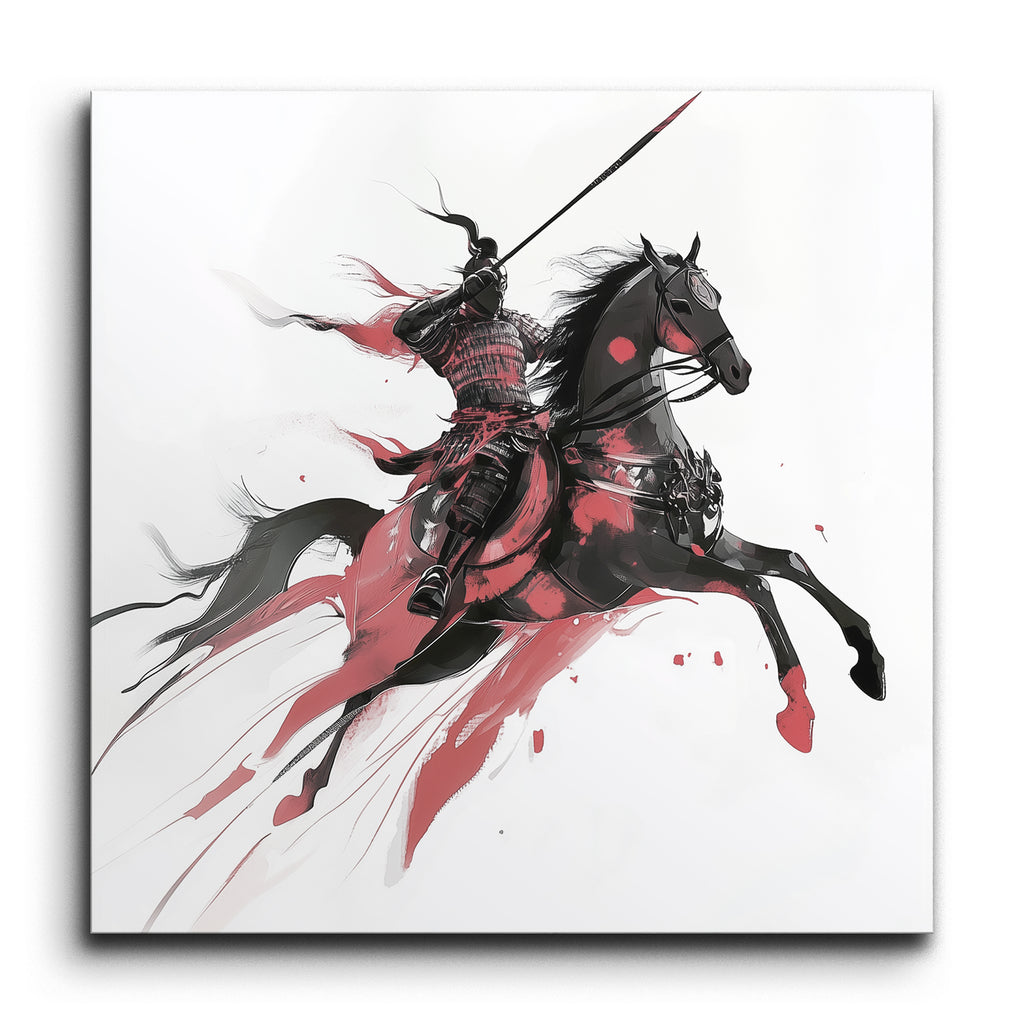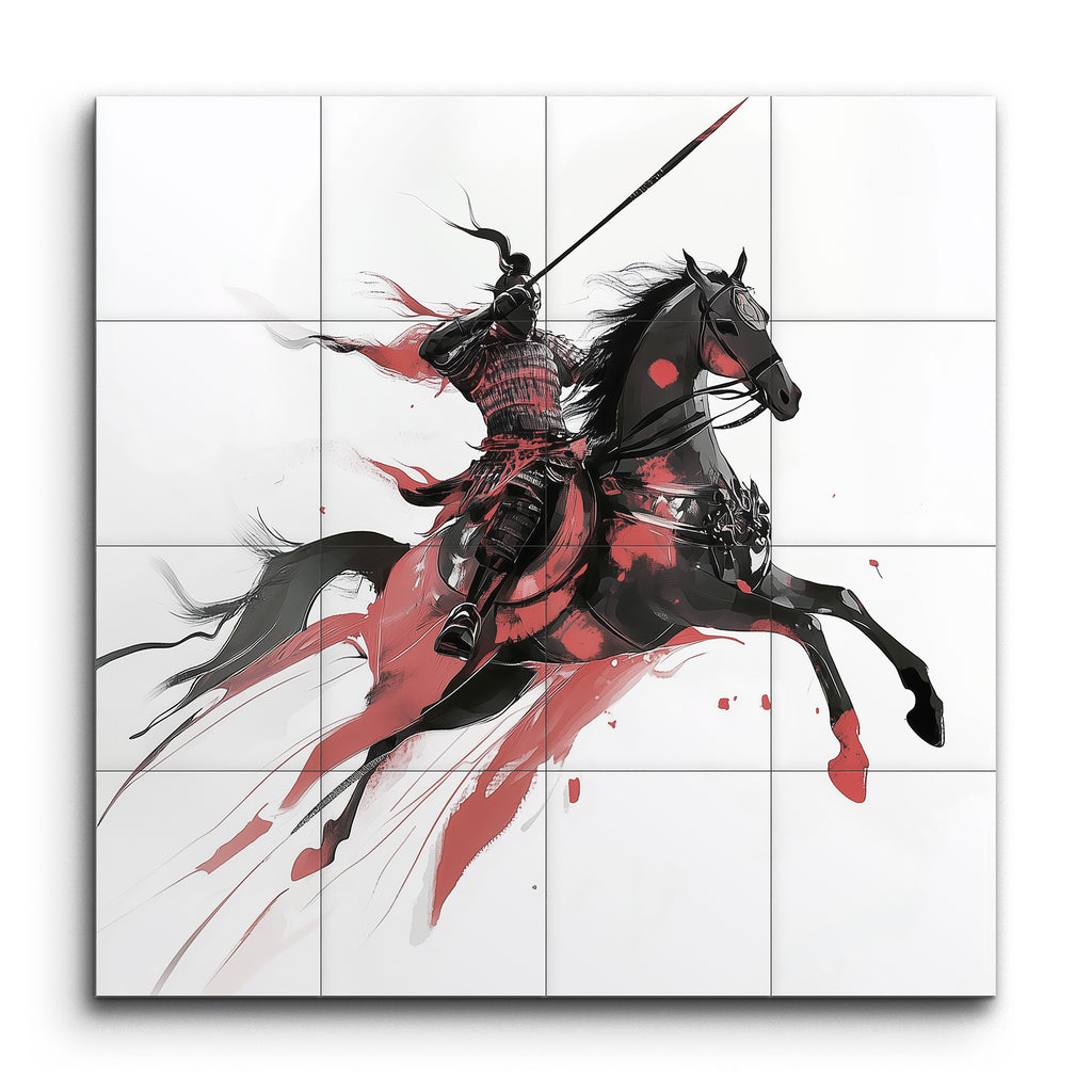 Sumérgete en la poderosa energía de nuestro mural de azulejos, que captura una escena dinámica de un guerrero en armadura tradicional, a medio galope sobre un caballo. El guerrero, con la espada en alto, y el caballo, con la melena ondeando, crean una sensación de movimiento y acción. Líneas audaces y salpicaduras de color, predominantemente oscuras con acentos rojos llamativos, evocan urgencia e intensidad. Esta obra de arte combina magistralmente elementos tradicionales y modernos, resultando en una composición visualmente impactante y equilibrada que atrae la atención.
