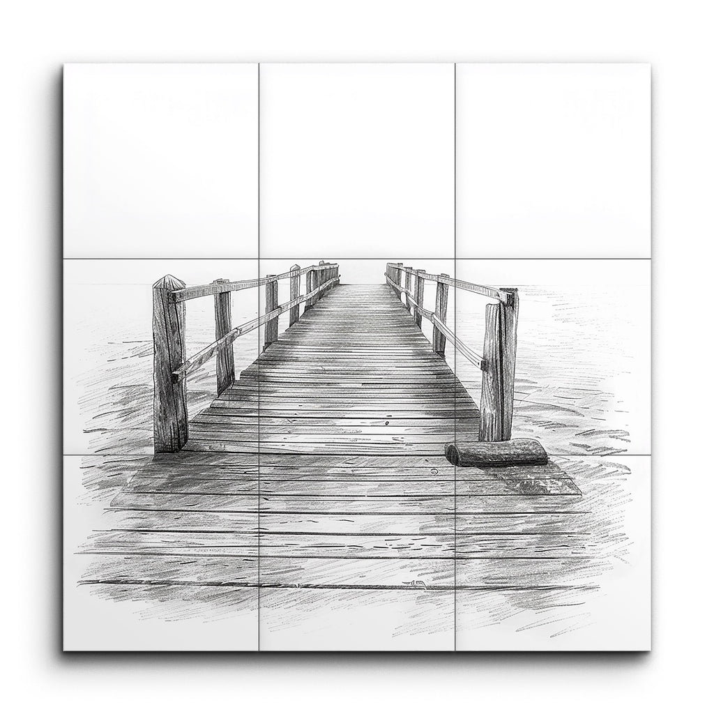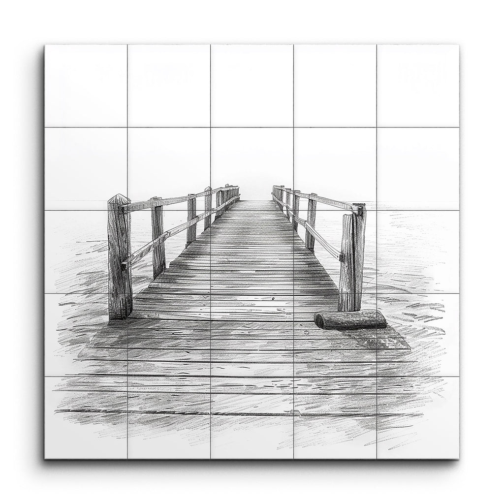 Transforma tu espacio con nuestro cautivador mural de azulejos, que presenta un muelle de madera meticulosamente detallado que se extiende hacia un sereno cuerpo de agua. La veta de madera realista y las barandillas texturizadas atraen la mirada hacia el horizonte, creando una sensación de profundidad e infinito. Representada en un estilo altamente realista, el sombreado preciso y el trabajo de líneas de esta obra evocan un ambiente tranquilo y contemplativo, perfecto para fomentar la reflexión silenciosa en cualquier habitación.