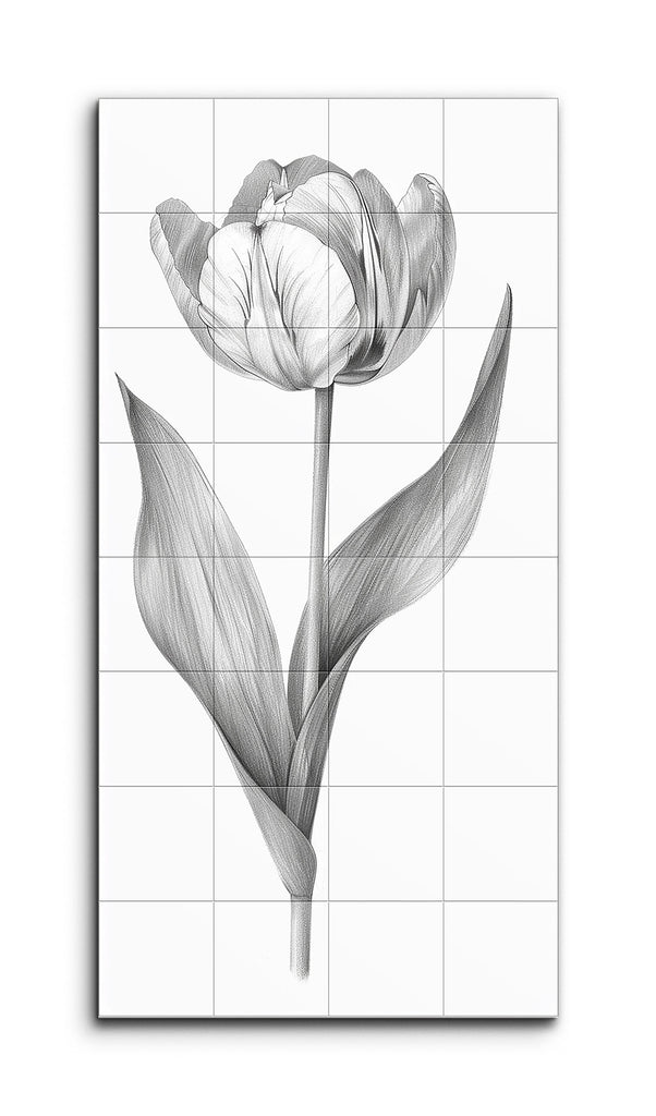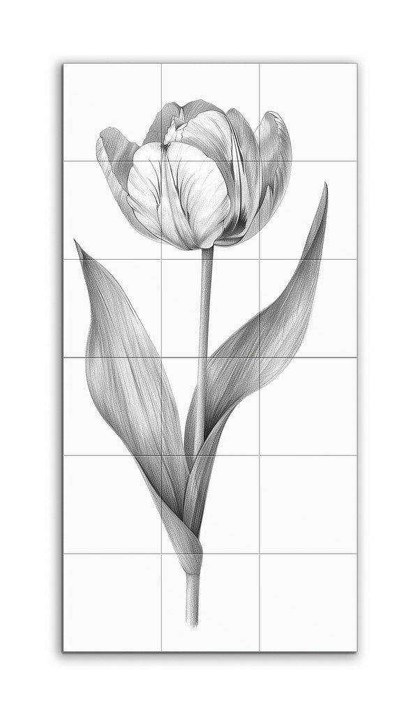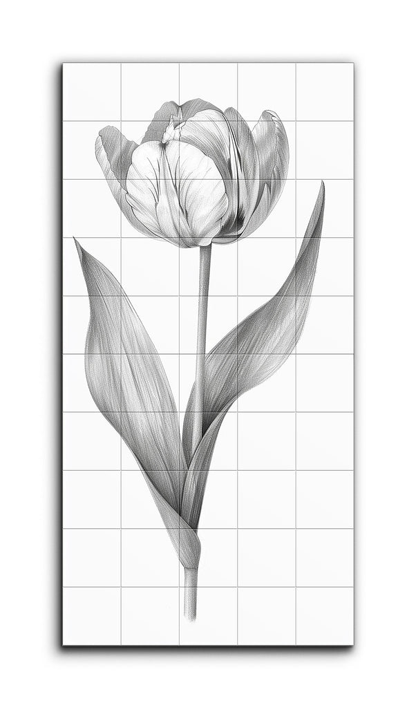Este mural de azulejos presenta una ilustración detallada y monocromática de un tulipán, representada con líneas finas y precisas que enfatizan la textura y la forma de la flor. Los pétalos intrincadamente dibujados muestran venas delicadas y sombras sutiles, dándoles una apariencia vívida y tridimensional. Hojas alargadas y elegantemente curvadas con estriaciones detalladas complementan el tallo delgado y recto. El estilo altamente realista, que recuerda a las ilustraciones botánicas tradicionales, utiliza el blanco y negro para realzar el enfoque en la forma y la textura, creando una estética atemporal y elegante.