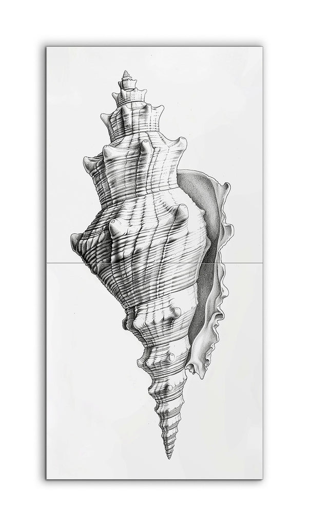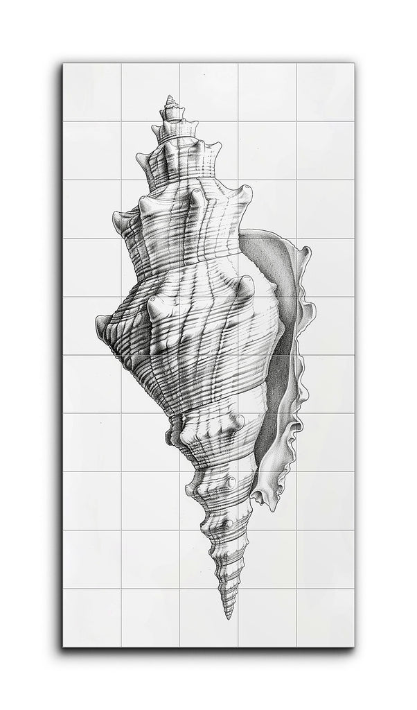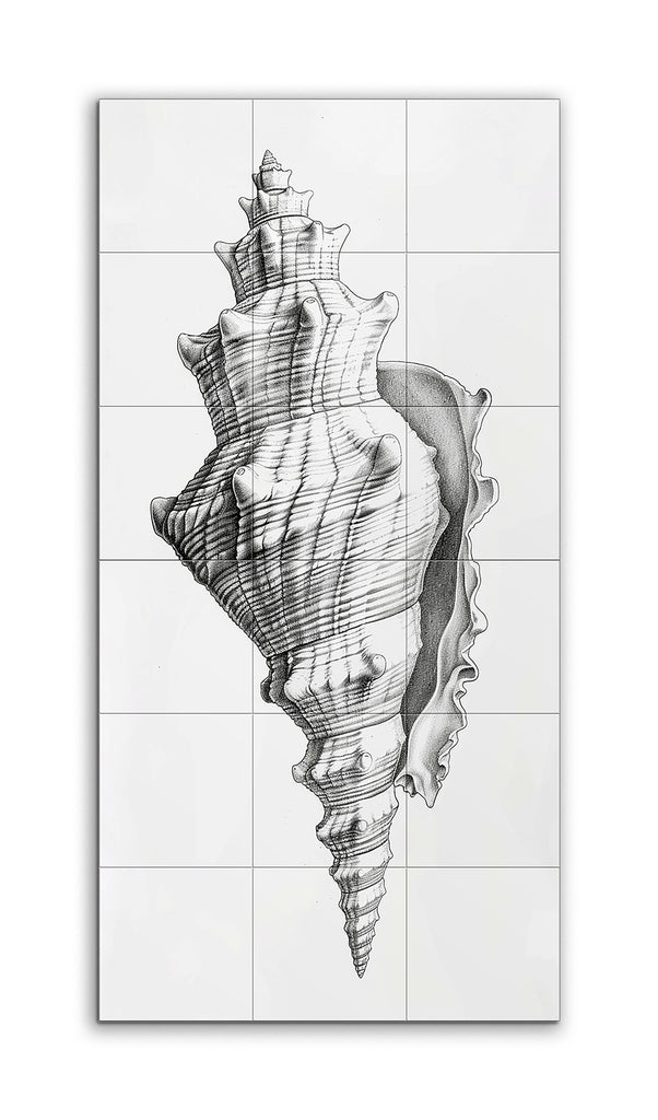Este mural de azulejos presenta una ilustración altamente detallada y realista de una concha marina. La estructura intrincada y en espiral y la textura estriada en capas se capturan en blanco y negro, con líneas finas y un sombreado meticuloso. Los tonos de luz y oscuridad variables resaltan los contornos y la profundidad de la concha, dándole una apariencia tridimensional. Recordando a las ilustraciones científicas, la precisión de la obra de arte y la atención al detalle hacen que la concha marina parezca casi viva.