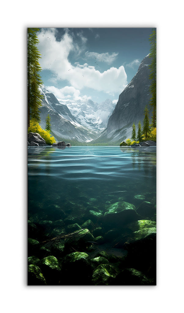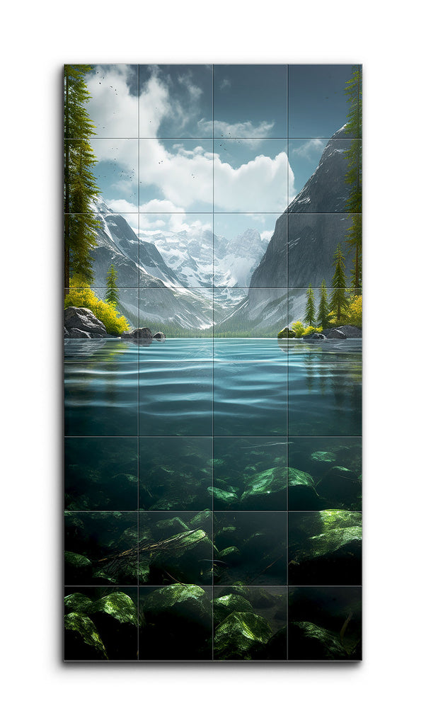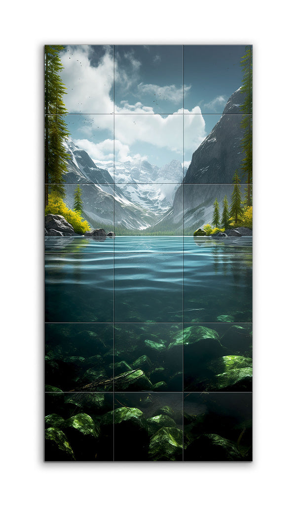 Este mural de azulejos muestra un sereno paisaje montañoso, con un lago tranquilo de aguas cristalinas que revela rocas verdosas debajo. Suaves ondulaciones reflejan los vibrantes árboles de hoja perenne que enmarcan la vista a ambos lados. Montañas imponentes, cubiertas de nieve, se elevan majestuosas en el fondo, bajo un cielo parcialmente nublado con parches de azul. La obra de arte altamente realista cuenta con un meticuloso detalle, colores vívidos y un intrincado juego de luz y sombra, creando una escena vívida de profundidad y tranquilidad.