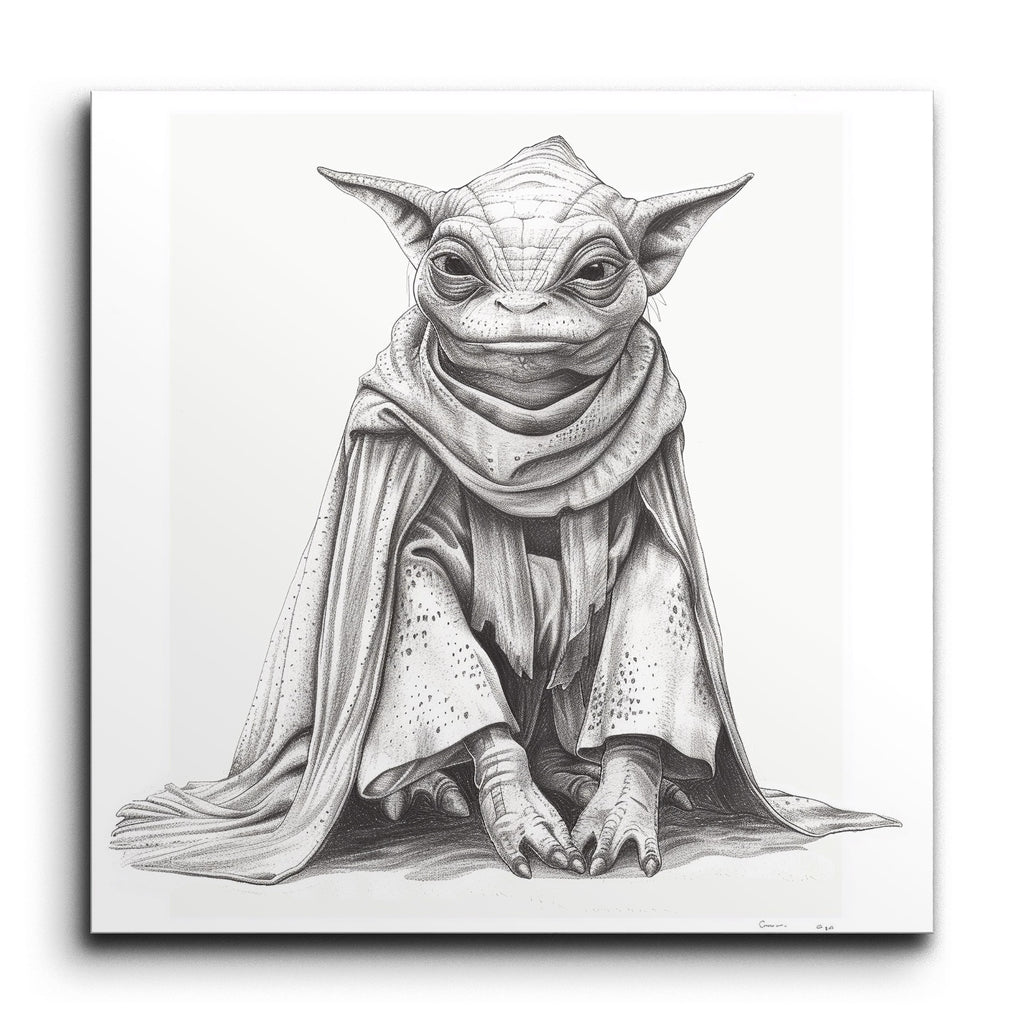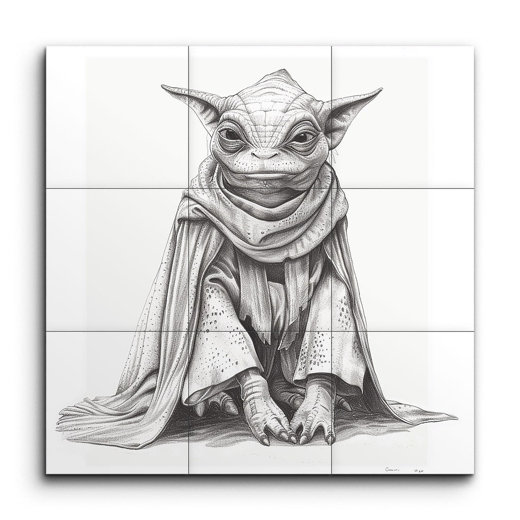 Sumérgete en un mundo de contemplación y sabiduría con este impresionante mural de azulejos. La obra presenta un dibujo a lápiz monocromático meticulosamente detallado de una criatura alienígena serena y sabia, con grandes ojos expresivos y orejas puntiagudas y distintivas. Envuelto en una túnica fluida y texturizada, el personaje irradia calma y profundidad. La habilidad del artista es evidente en cada pliegue de la túnica y en cada línea de la piel texturizada de la criatura, convirtiéndolo en una pieza atemporal que invita a la reflexión y la admiración.
