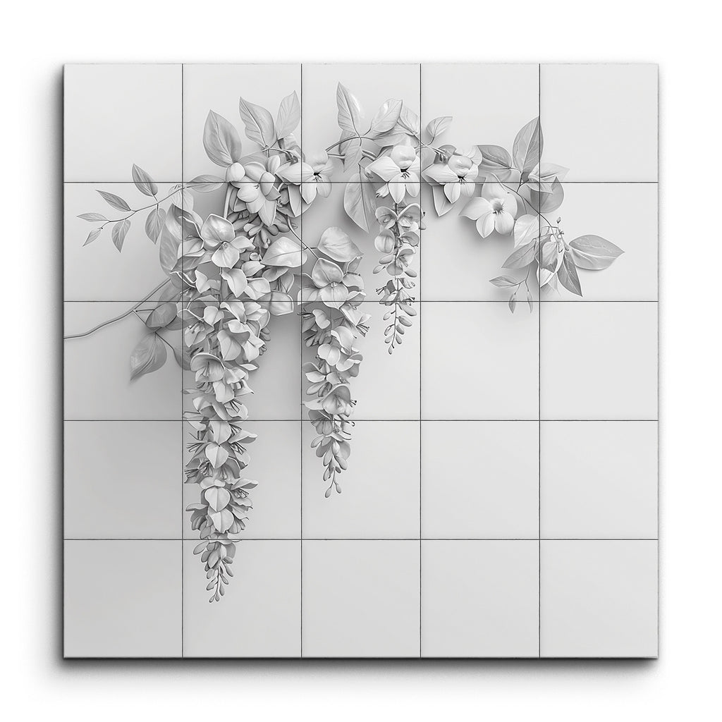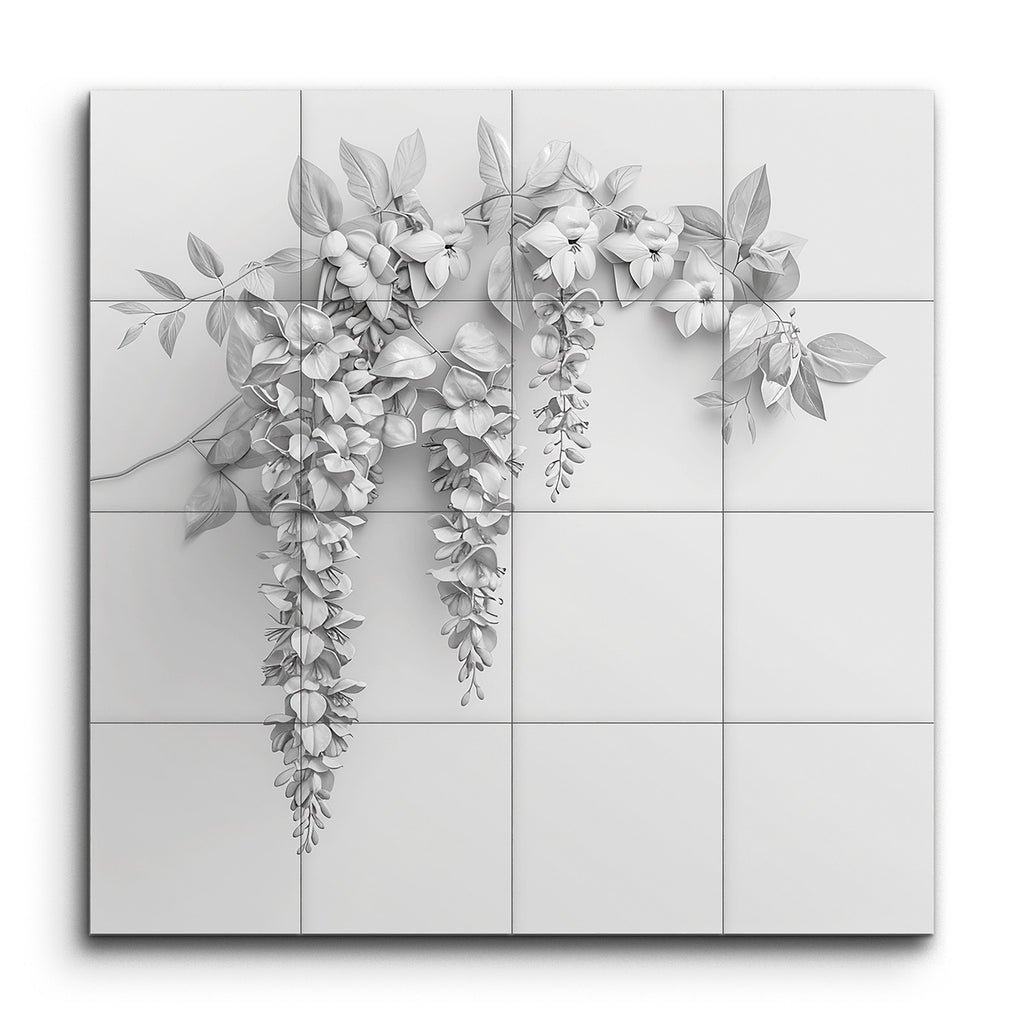 Experimenta la elegante serenidad de la naturaleza con nuestro exquisito mural de azulejos, que presenta una representación realista de las flores de glicinia en cascada y hojas exuberantes. Cada pétalo y hoja está meticulosamente representado para capturar sus delicadas texturas y curvas naturales. Los tonos monocromáticos crean una estética atemporal y calmante, destacando los intrincados detalles y la composición elegante. Este mural te invita a sumergirte en la belleza refinada de la naturaleza, ofreciendo un punto focal sofisticado y tranquilo para cualquier espacio.