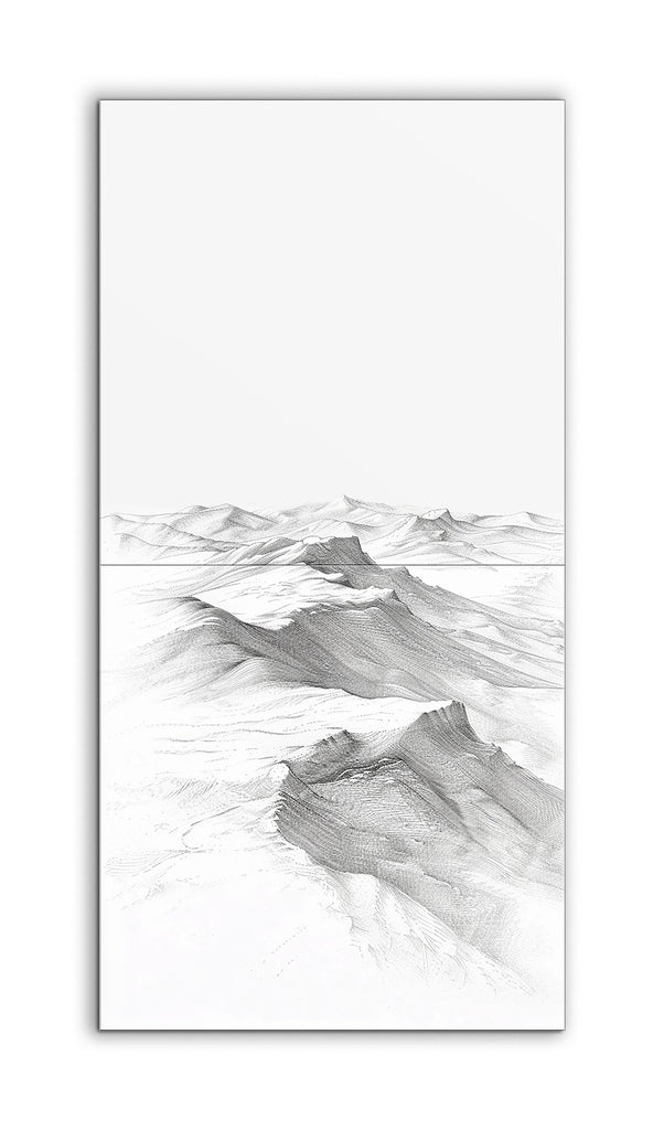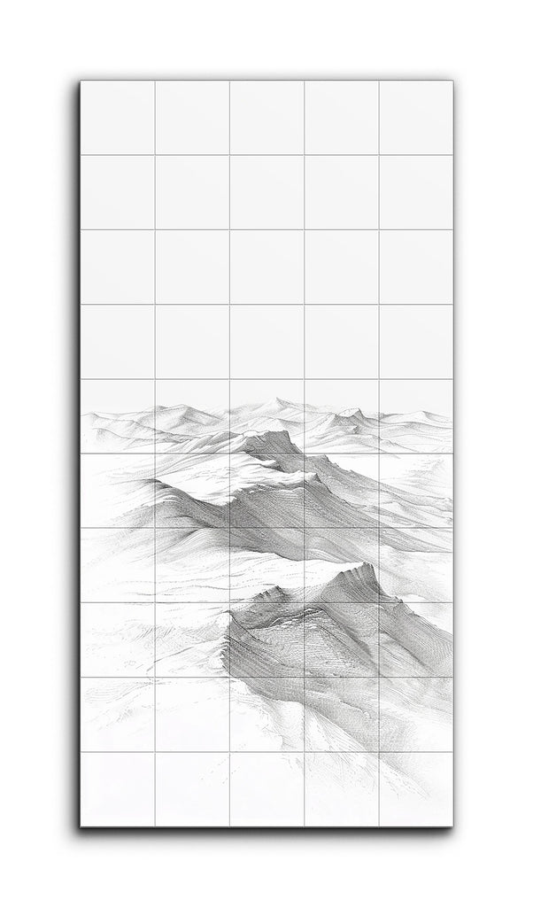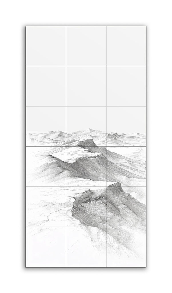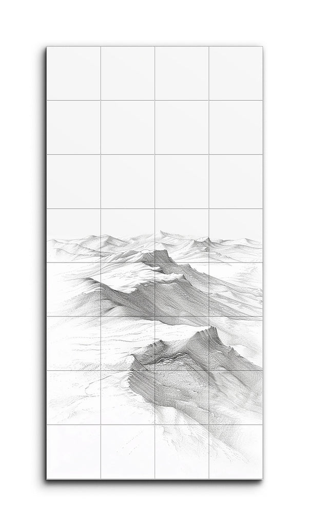 Este mural de azulejos presenta un paisaje montañoso minimalista pero intrincadamente detallado, representado en una paleta monocromática de grises. Las montañas, representadas con líneas finas y sutiles sombras, exudan una apariencia texturizada, casi topográfica. La composición está orientada verticalmente, con picos claramente definidos y valles suavemente sombreados ocupando los dos tercios inferiores, mientras que el tercio superior permanece en blanco, destacando el vasto cielo abierto. La mezcla de realismo y abstracción crea una atmósfera serena y contemplativa.