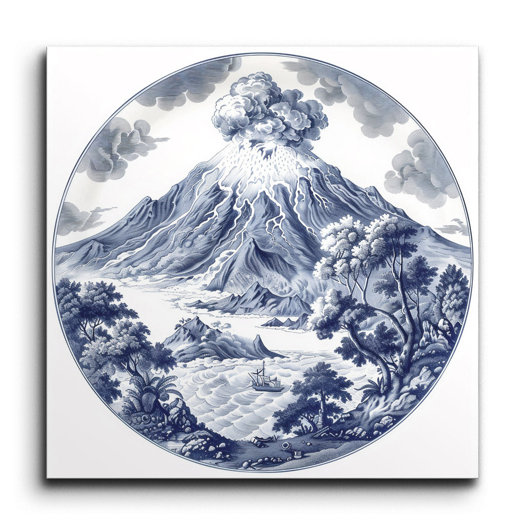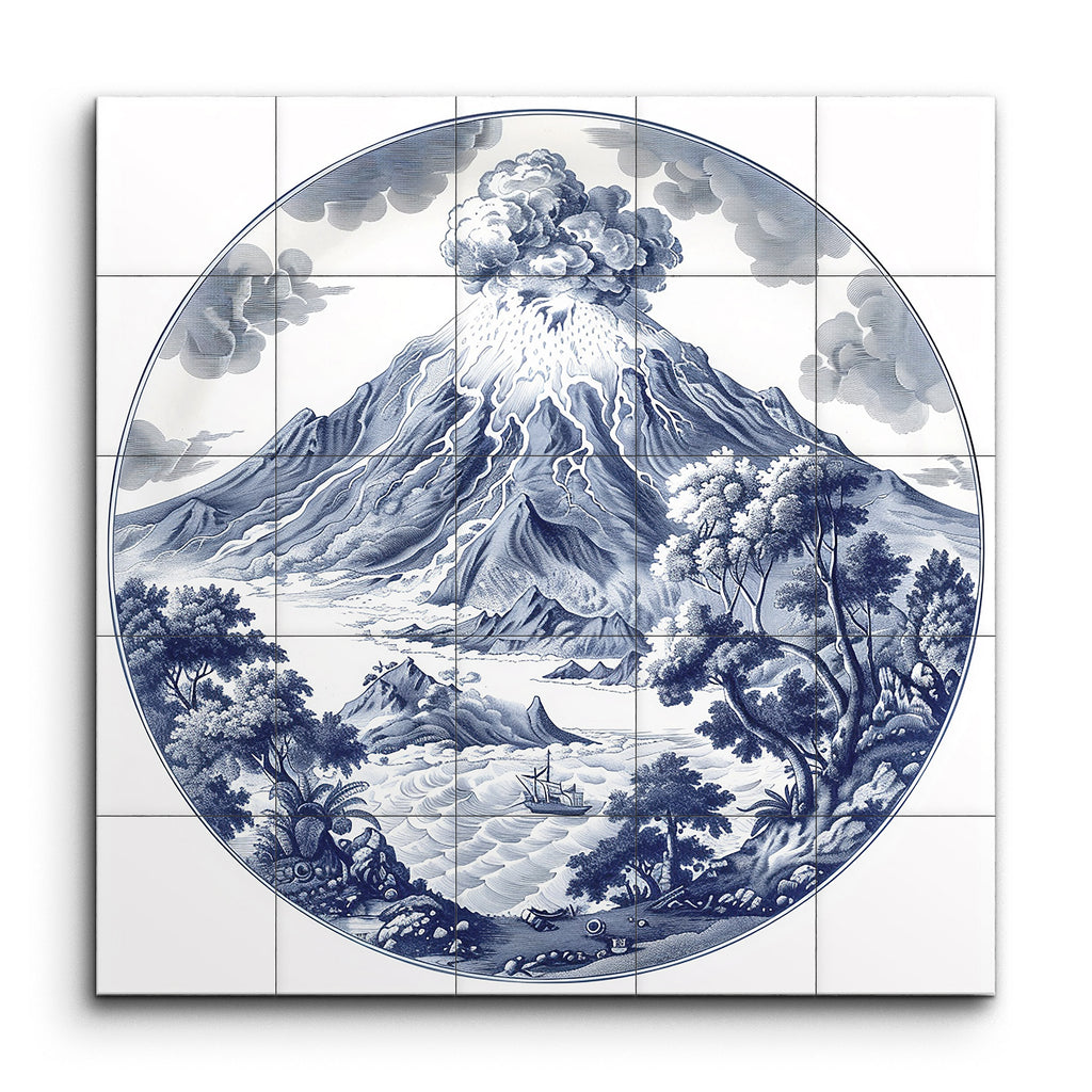 Transforma tu espacio con este impactante mural de azulejos que presenta una impresionante ilustración circular de un dramático paisaje volcánico. En su corazón, un poderoso volcán erupciona, enviando humo y ceniza que se elevan hacia el cielo, capturando la energía cruda de la naturaleza. En contraste, el primer plano ofrece una escena serena con un pequeño bote deslizándose sobre suaves olas, rodeado de árboles y follaje exuberantes. Representada en una paleta atemporal de azul y blanco, esta obra de arte evoca la elegancia de la cerámica tradicional de Delft y la Porcelana, aportando tanto tranquilidad como movimiento dinámico a tu Decoración.