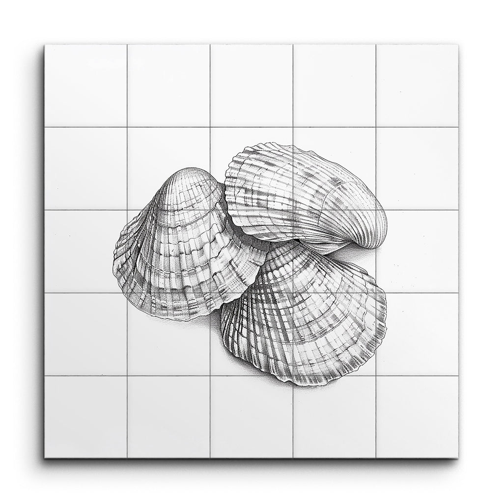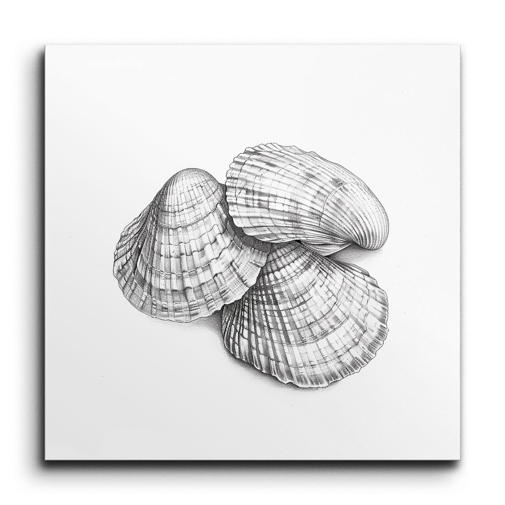 Este mural de azulejos muestra un boceto detallado y realista de tres conchas marinas, dibujadas intrincadamente con líneas finas y sombras para crear un efecto tridimensional. Cada concha presenta un patrón único de crestas y surcos, capturando su textura natural. Los tonos monocromáticos enfatizan los delicados detalles y contornos, mientras que la composición simple pero elegante resalta la belleza natural y la estructura de las conchas. El estilo es reminiscentemente de ilustraciones científicas, enfatizando la precisión y el detalle.