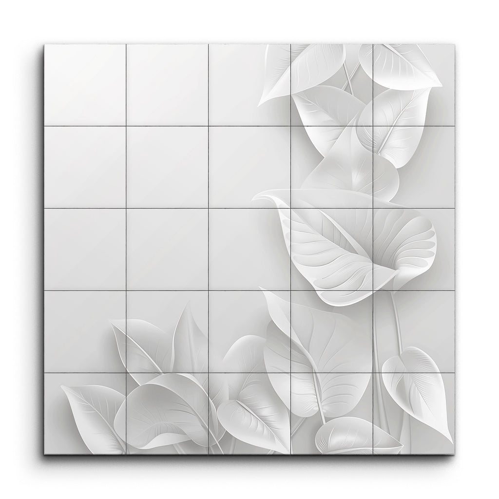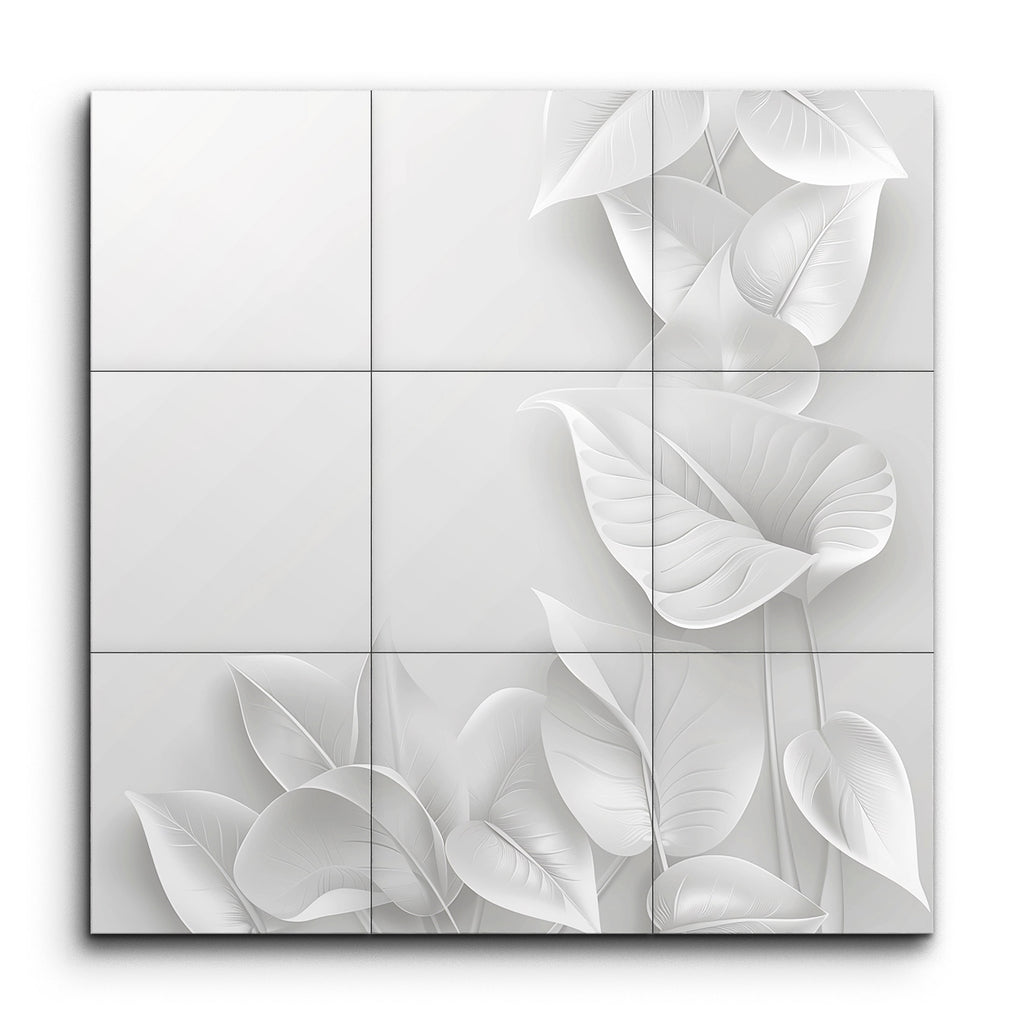 Transforma tu espacio con este cautivador mural de azulejos que presenta una obra maestra monocromática de hojas dispuestas de manera intrincada. Cada hoja, representada en diferentes tamaños y formas, se entrelaza suavemente con líneas fluidas y sutiles degradados, creando un efecto en capas que exuda complejidad. El delicado uso de la luz y la sombra realza su apariencia tridimensional, casi etérea. Esta obra de arte minimalista pero elegante enfatiza la belleza natural de las hojas, aportando un toque sereno y sofisticado a cualquier entorno.