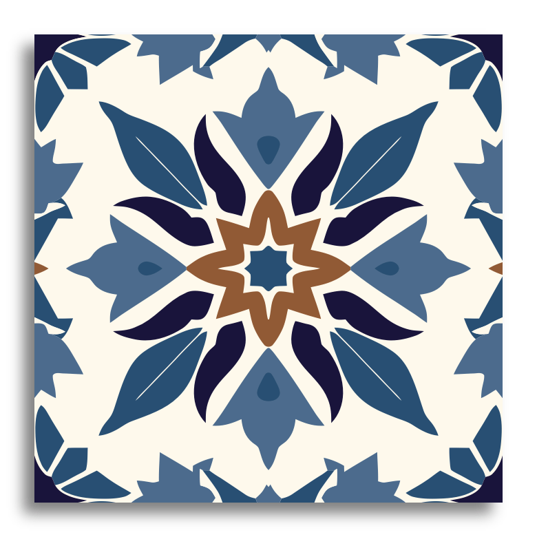 This decorative tile presents an exquisite encaustic pattern, characterized by a symmetrical and intricate design. At its heart lies a star-like motif in a rich green, encircled by petal shapes in deep blue and warm brown. The geometric and floral elements come together seamlessly, enhanced by a harmonious blend of earthy tones. Set against a light cream background, the darker hues of the pattern emerge vividly, creating a striking visual contrast. The detailed and ornate design pays homage to traditional encaustic tile patterns, reminiscent of historical and classical decor styles.