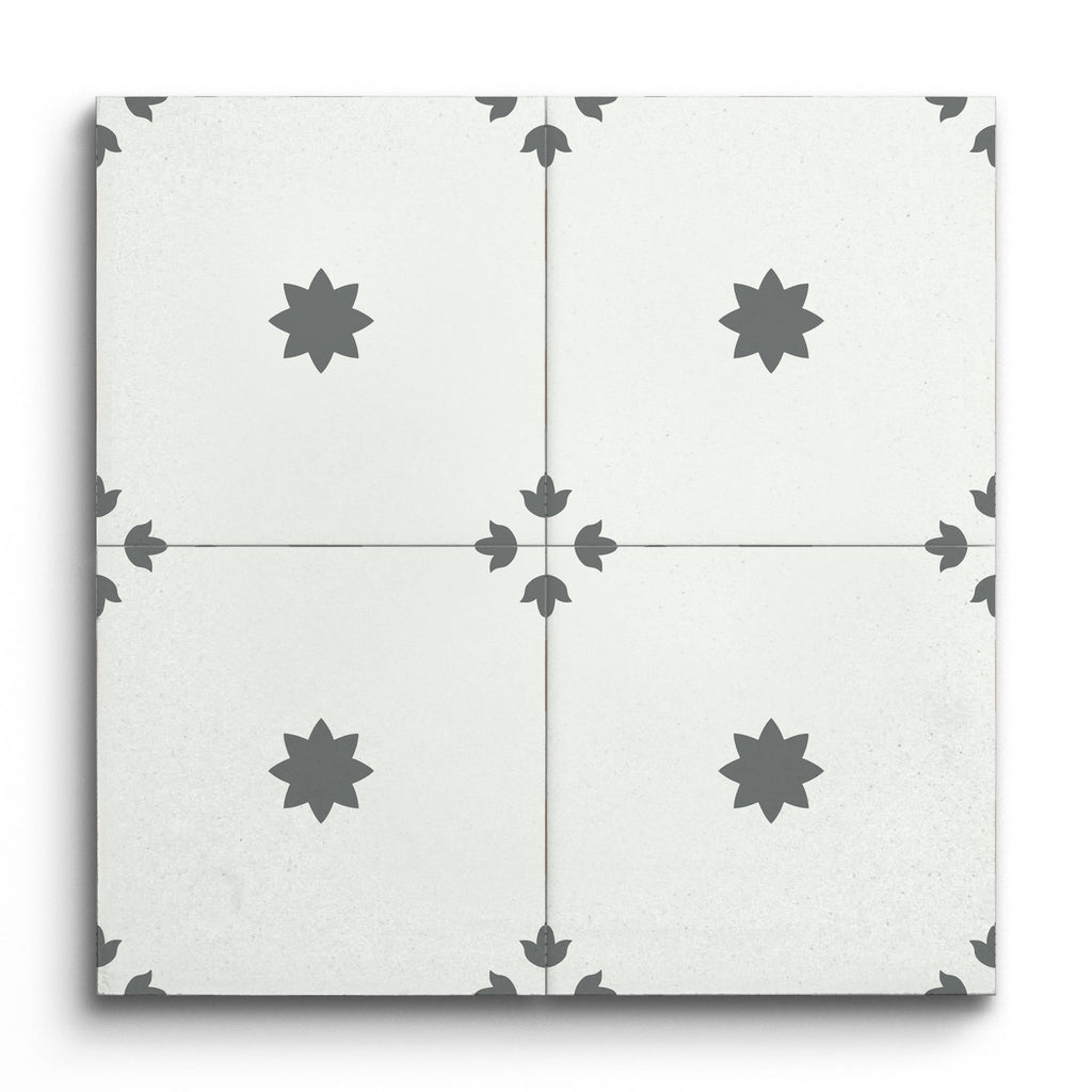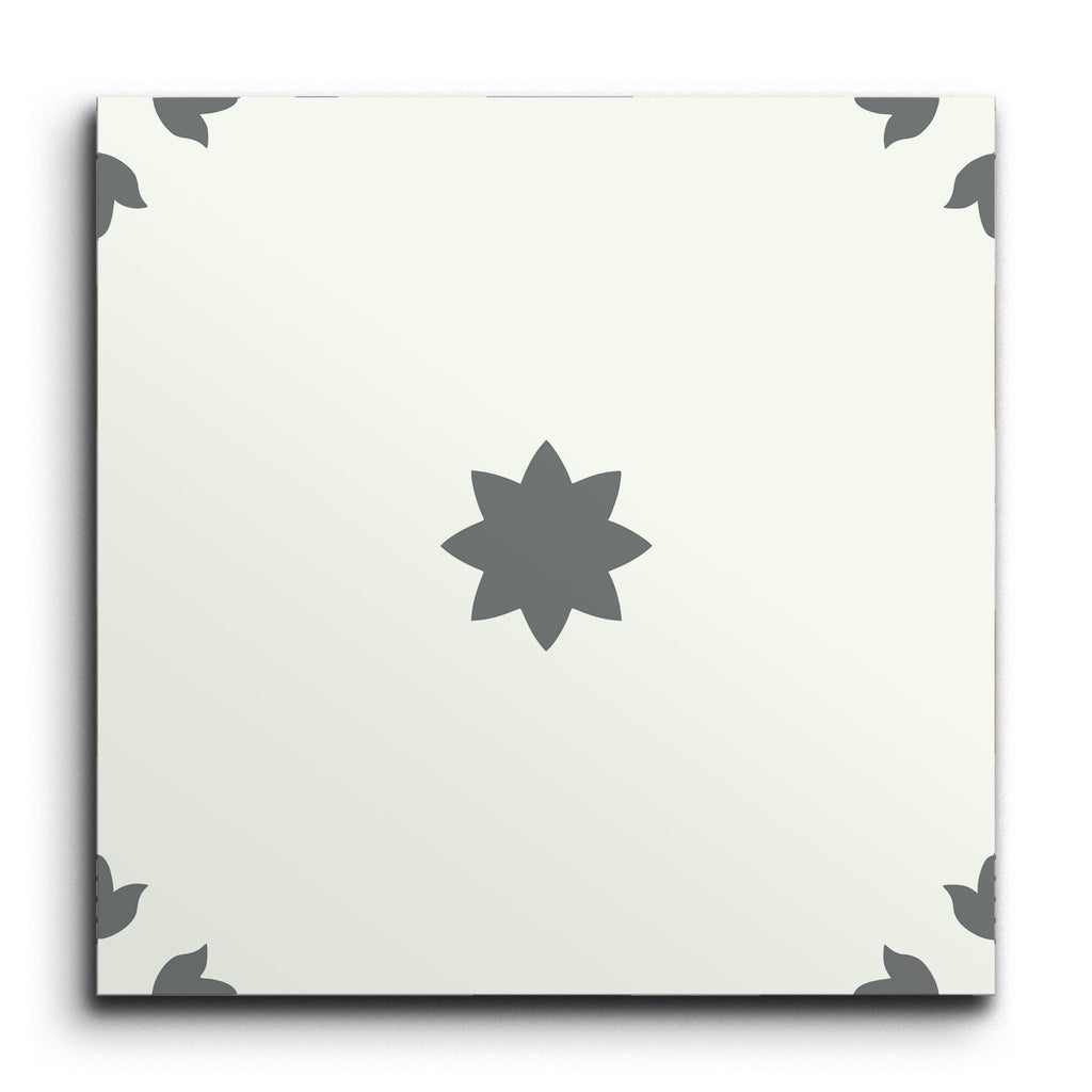 Esta baldosa decorativa exhibe una estética minimalista con su motivo central en forma de estrella de color gris oscuro sobre un fondo blanco nítido. El diseño está armoniosamente equilibrado con motivos similares en cada esquina, creando un aspecto simétrico y cohesivo. La paleta monocromática y las líneas limpias encarnan la simplicidad y la elegancia, lo que la convierte en una opción ideal para interiores modernos y contemporáneos.