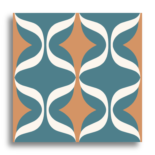 This decor tile showcases a striking geometric pattern with interlocking shapes that exude both movement and symmetry. It features a deep teal background, beautifully complemented by contrasting white and orange elements. The combination of curved lines and sharp angles creates a dynamic and modern aesthetic, perfectly capturing the essence of clean, structured geometric design.