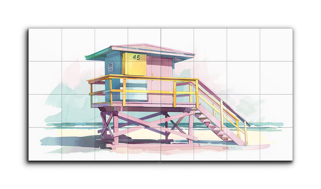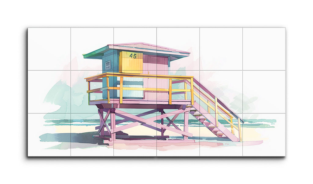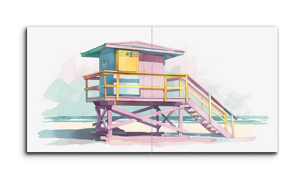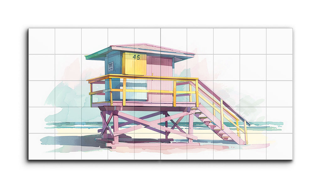 La obra de arte presenta una vibrante torre de salvavidas en un estilo moderno e ilustrativo. Elevada sobre vigas cruzadas moradas con una escalera que lleva hacia arriba, la plataforma está rodeada por una barandilla en tonos rosa y amarillo, evocando una atmósfera de playa soleada. La cabaña en la parte superior está pintada en tonos verde azulado, amarillo y rosa con el número "45" exhibido. El fondo presenta formas abstractas en suaves tonos azules y verdes, fusionando el mar y el cielo sin problemas. El uso de colores pastel y formas geométricas crea una vibra nostálgica y relajada de verano.