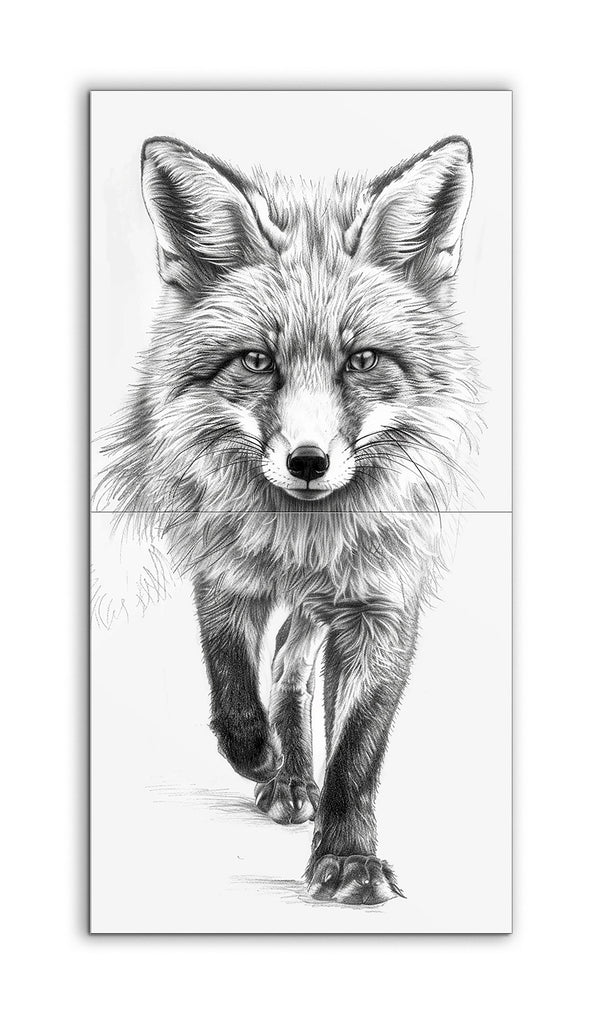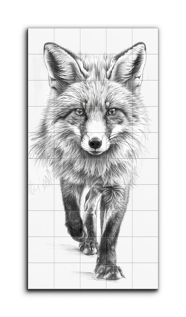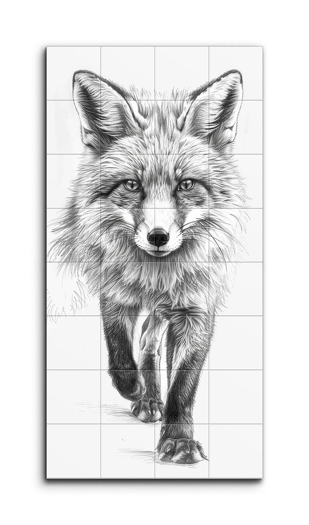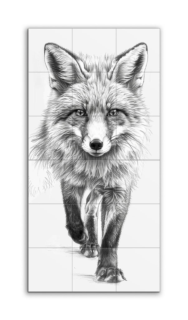 Este mural de azulejos presenta una ilustración hiperrealista de un zorro caminando hacia el espectador, creando una sensación de profundidad y compromiso. La meticulosa representación del pelaje con líneas finas y sombreados le da una textura realista, mientras que los ojos llamativos, completos con pupilas y reflejos detallados, añaden intensidad a la mirada. La composición equilibrada, con el zorro centrado y una pata ligeramente levantada, sugiere movimiento y vida. El fondo simple asegura que el zorro siga siendo el punto focal de esta obra de arte intrincada y dinámica.