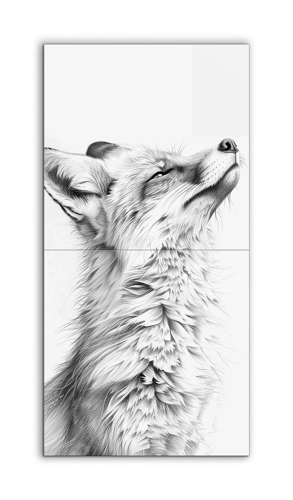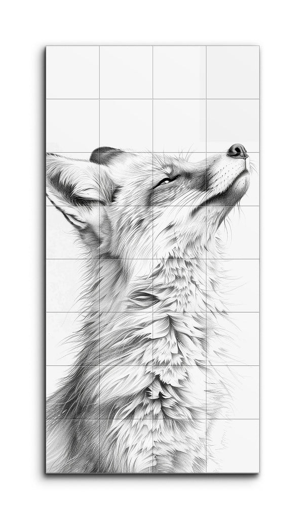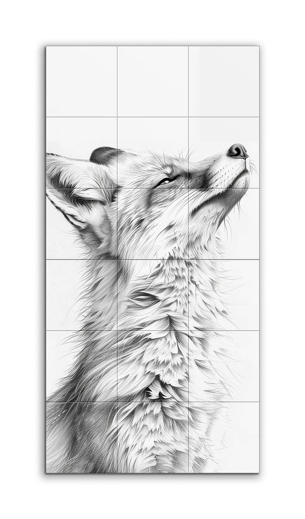Este mural de azulejos presenta un dibujo hiperrealista de un zorro de perfil, con la cabeza suavemente inclinada hacia arriba, exudando gracia y serenidad. La meticulosa atención al detalle del artista es evidente en las finas líneas que capturan la textura y suavidad del pelaje del zorro. El sombreado experto resalta los contornos y la profundidad de su abrigo, orejas y rasgos faciales. Los ojos cerrados del zorro realzan su expresión pacífica. Renderizada en blanco y negro, la obra tiene un atractivo clásico y atemporal, enfocándose en detalles intrincados y la sutil interacción de luz y sombra.